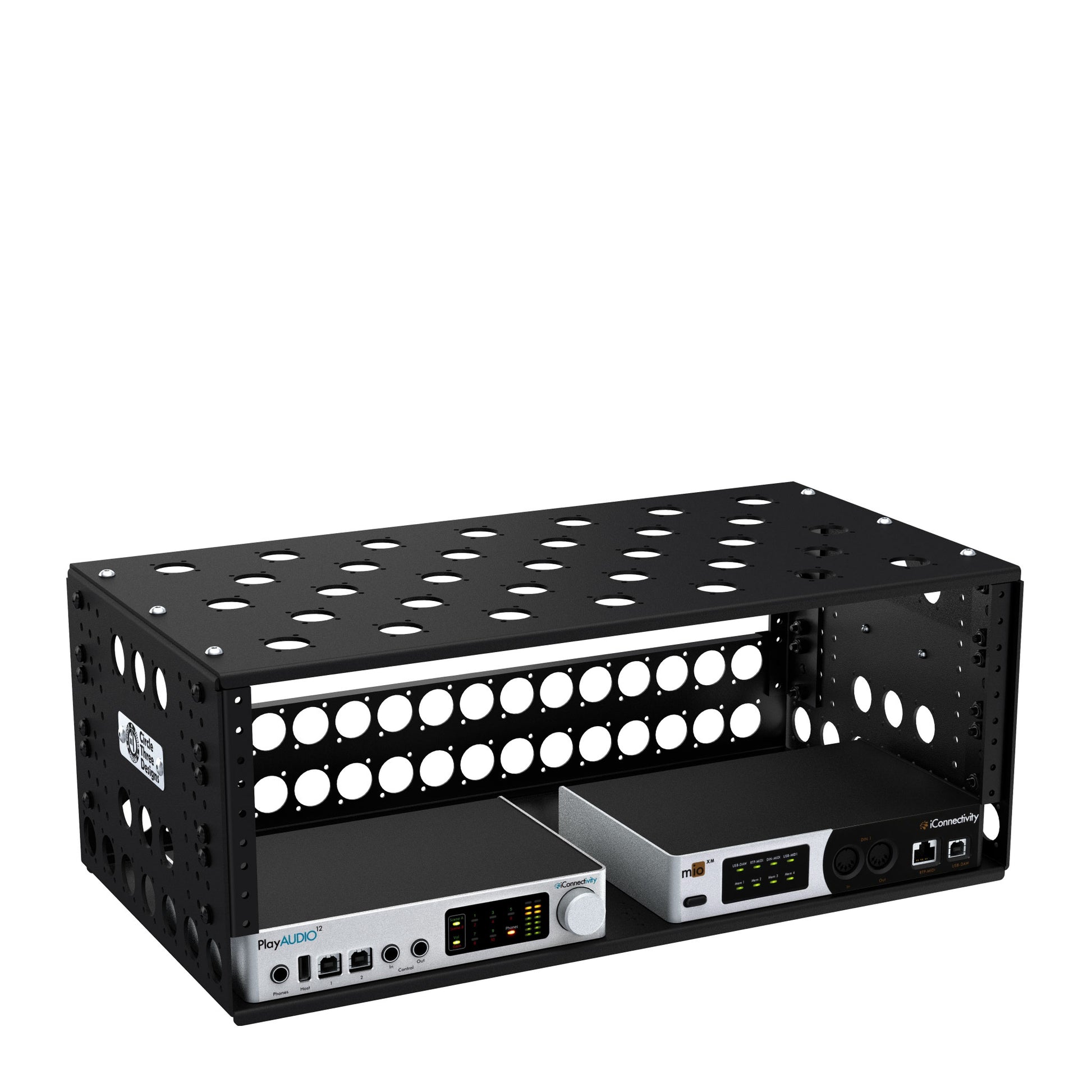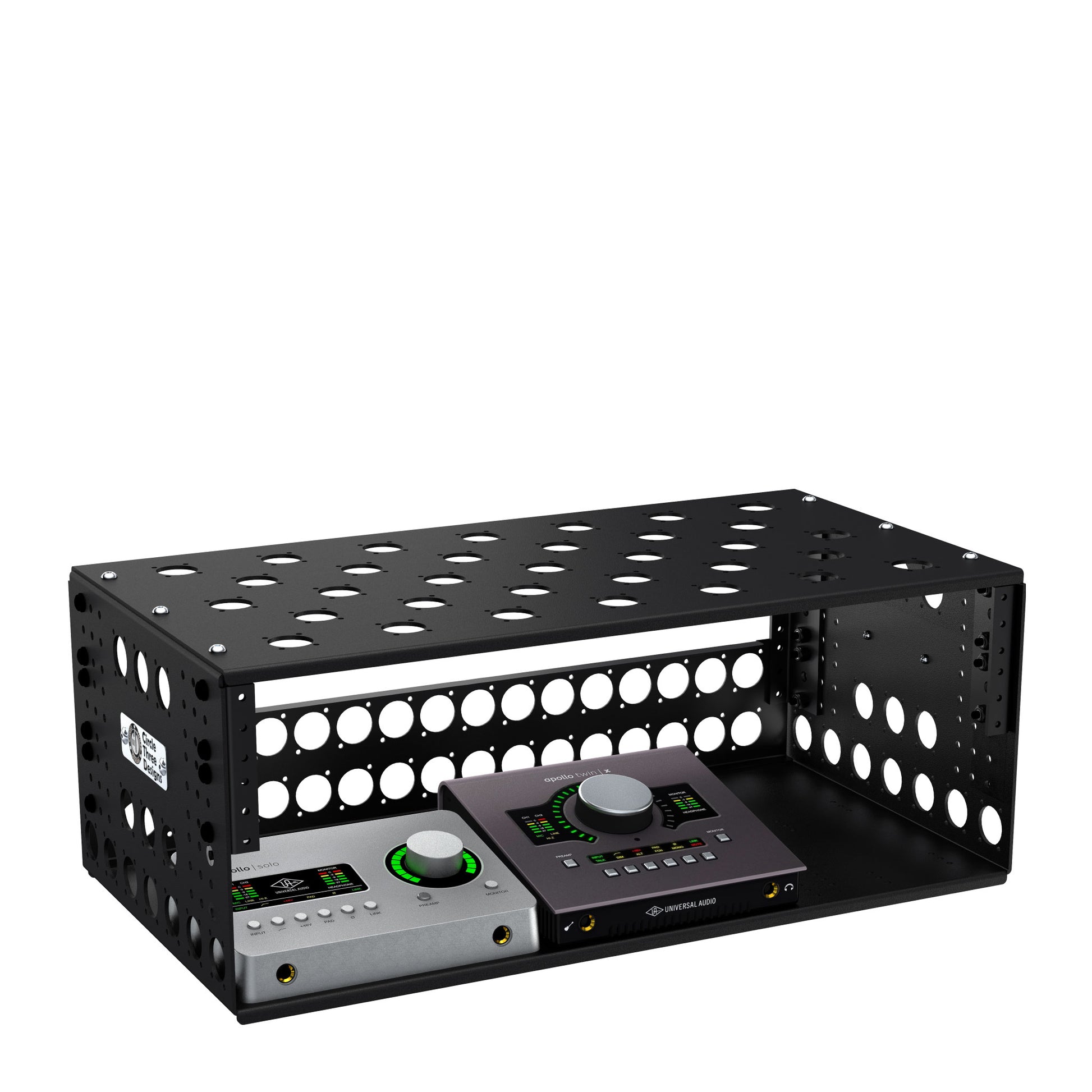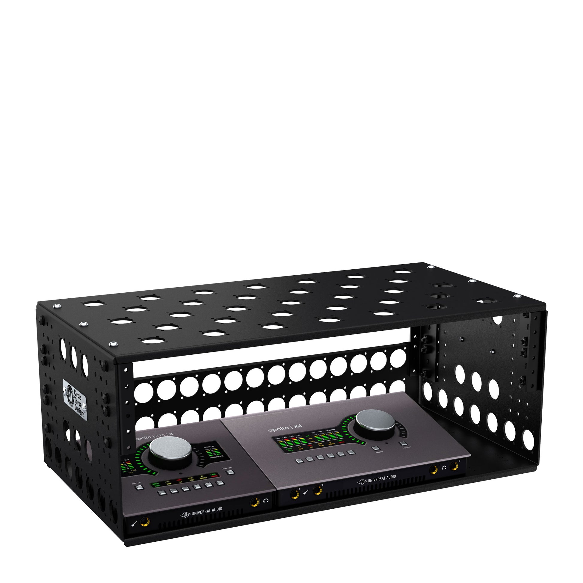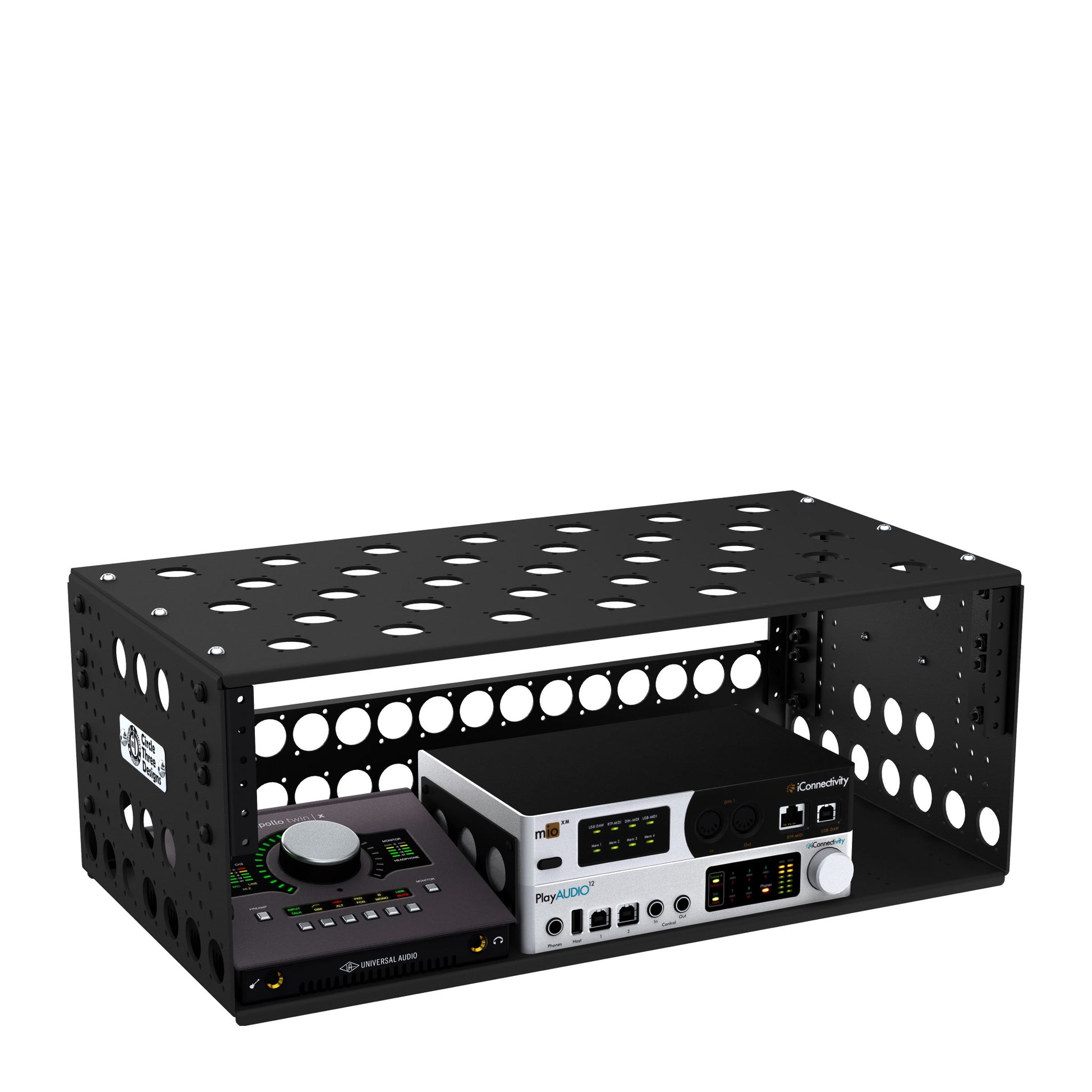 - The bottom of the rack has multiple holes and slots to accommodate the following: iConnectivty PlayAUDIO12 and MioXM, Apollo Twin, Apollo x4, Apollo Solo and Radial Backtrack. Scroll through the photos to see the possibilities.