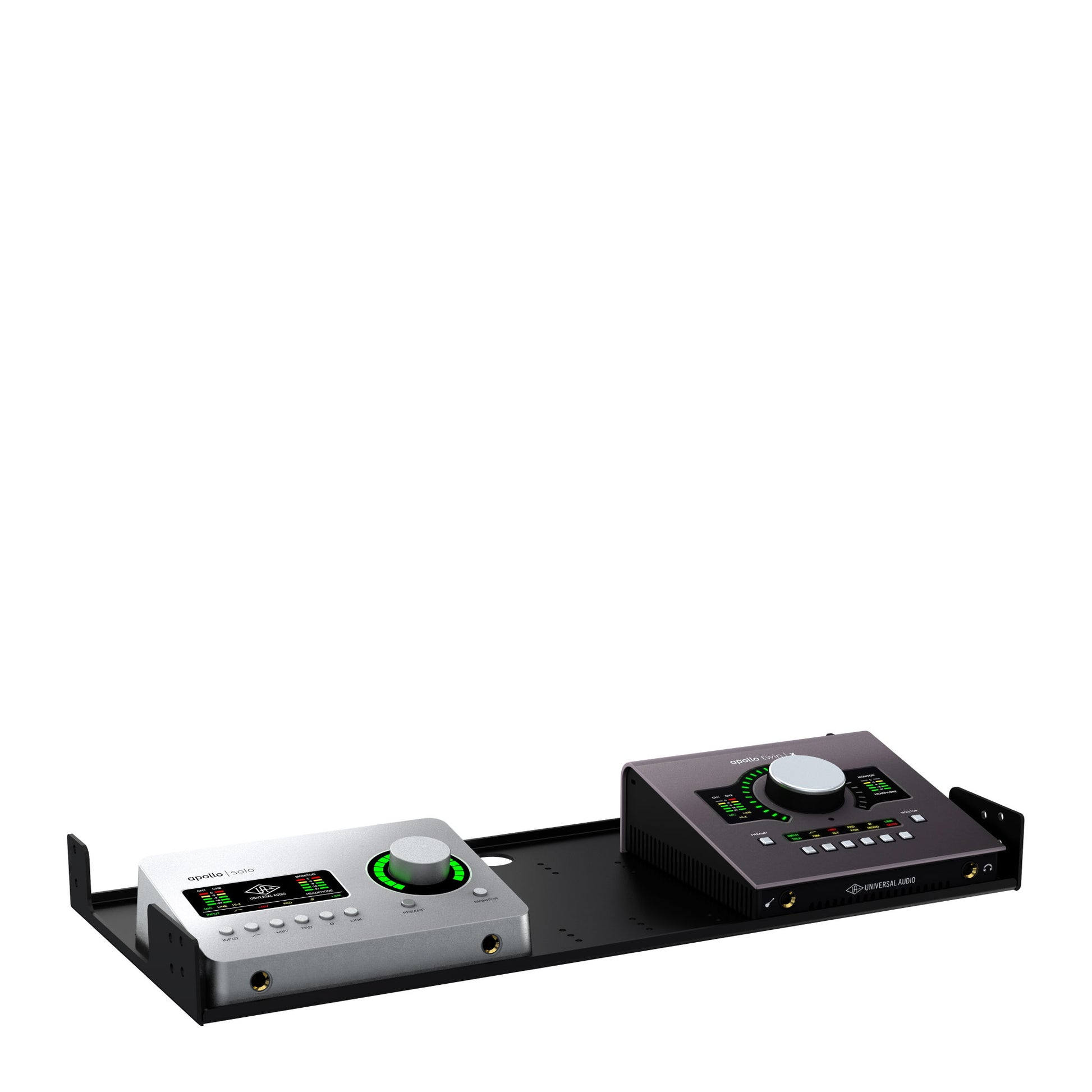 - The rack shelf has multiple holes and slots to accommodate the following: iConnectivty PlayAUDIO12 and MioXM, Apollo Twin, Apollo x4, Apollo Solo and Radial Backtrack. Scroll through the photos to see the possibilities.