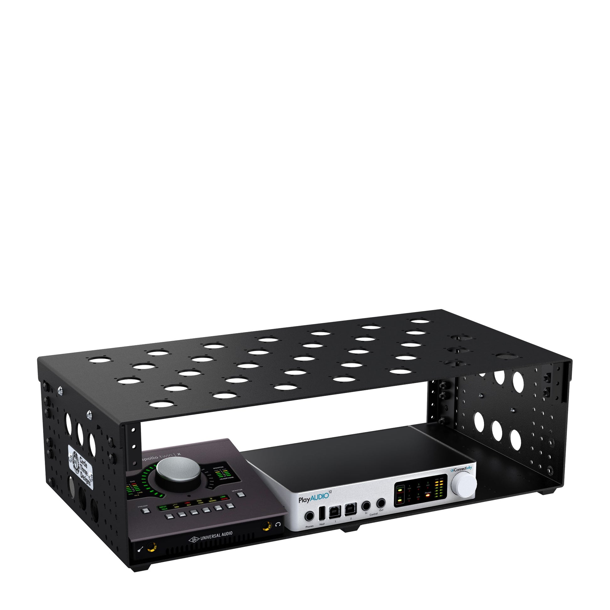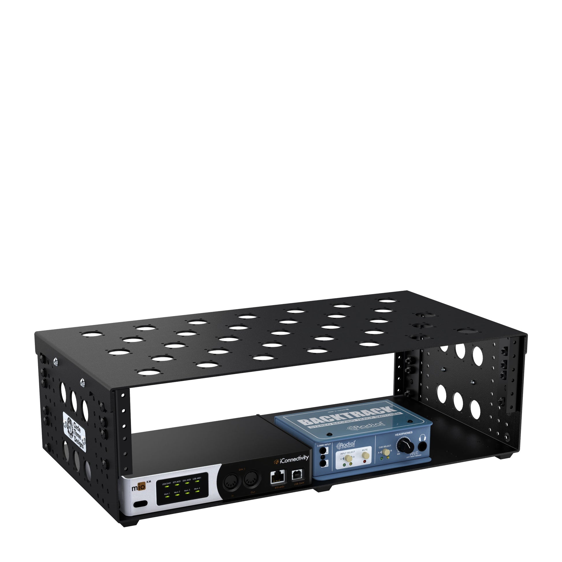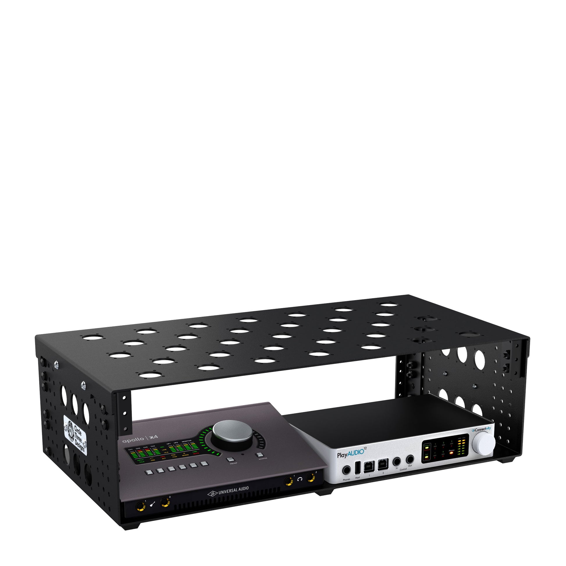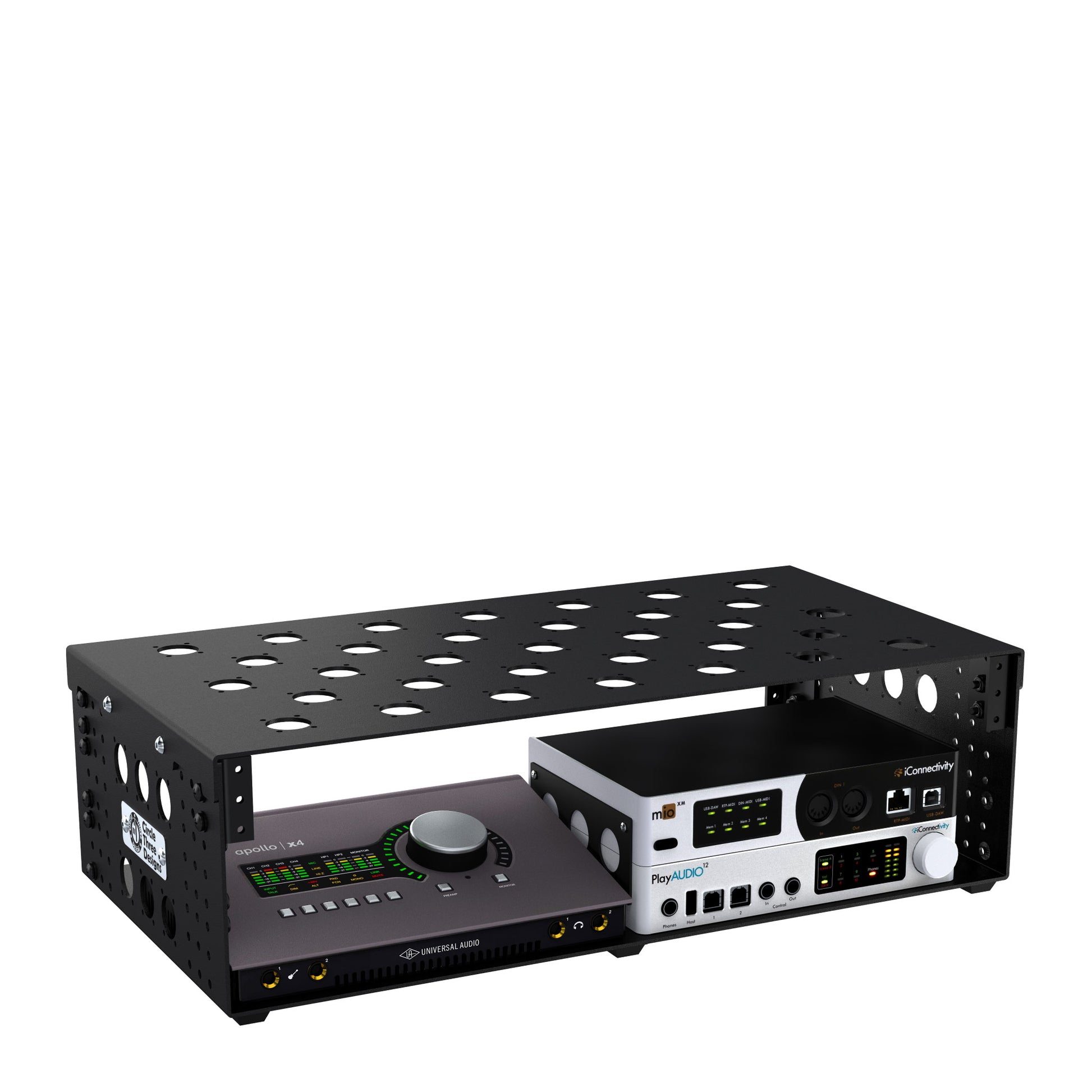 - The bottom of the rack has multiple holes and slots to accommodate the following: iConnectivty PlayAUDIO12 and MioXM, Apollo Twin, Apollo x4, Apollo Solo and Radial Backtrack. Scroll through the photos to see the possibilities.