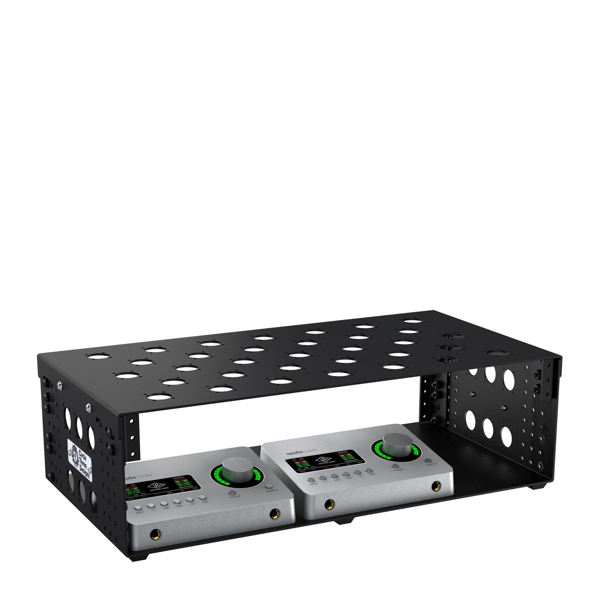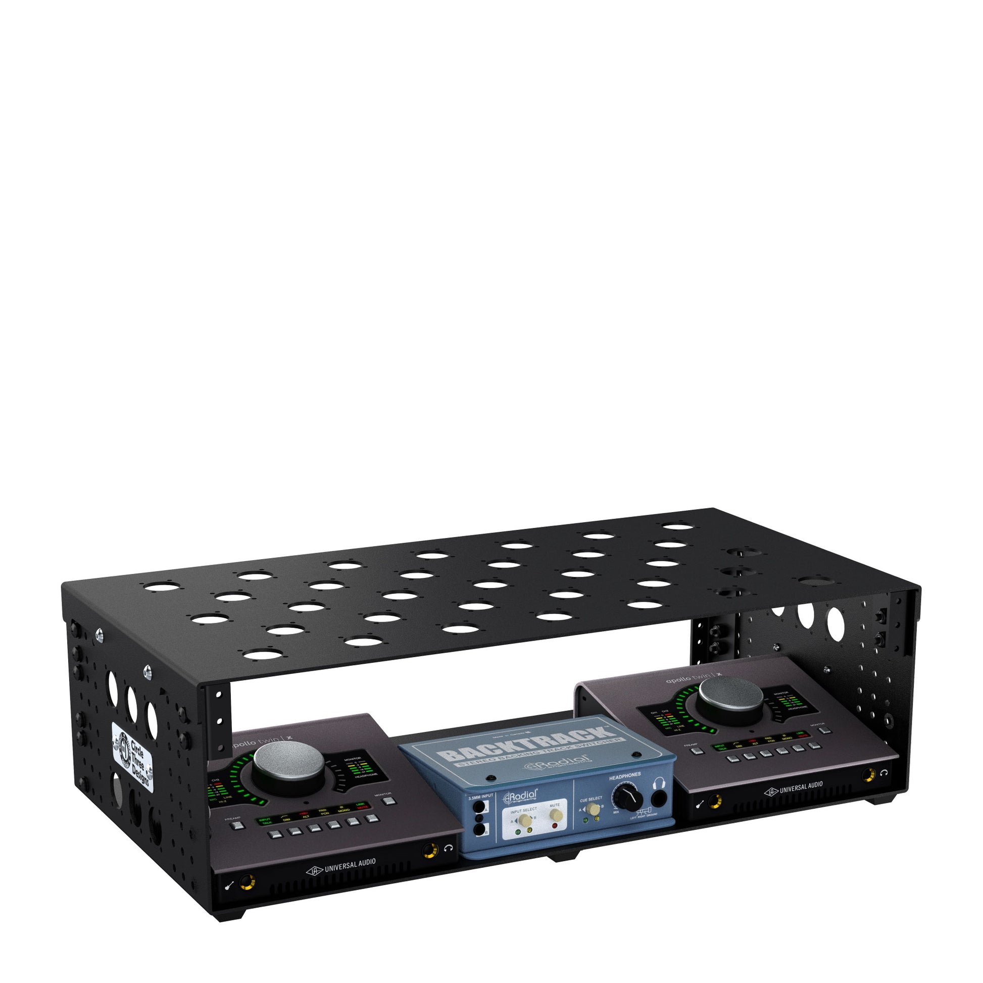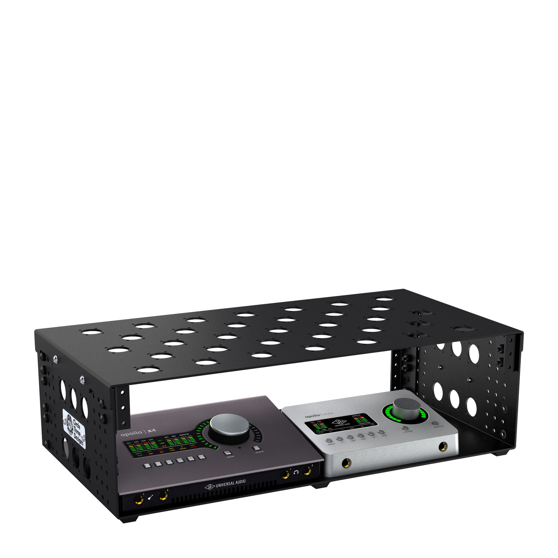 - The bottom of the rack has multiple holes and slots to accommodate the following: iConnectivty PlayAUDIO12 and MioXM, Apollo Twin, Apollo x4, Apollo Solo and Radial Backtrack. Scroll through the photos to see the possibilities.