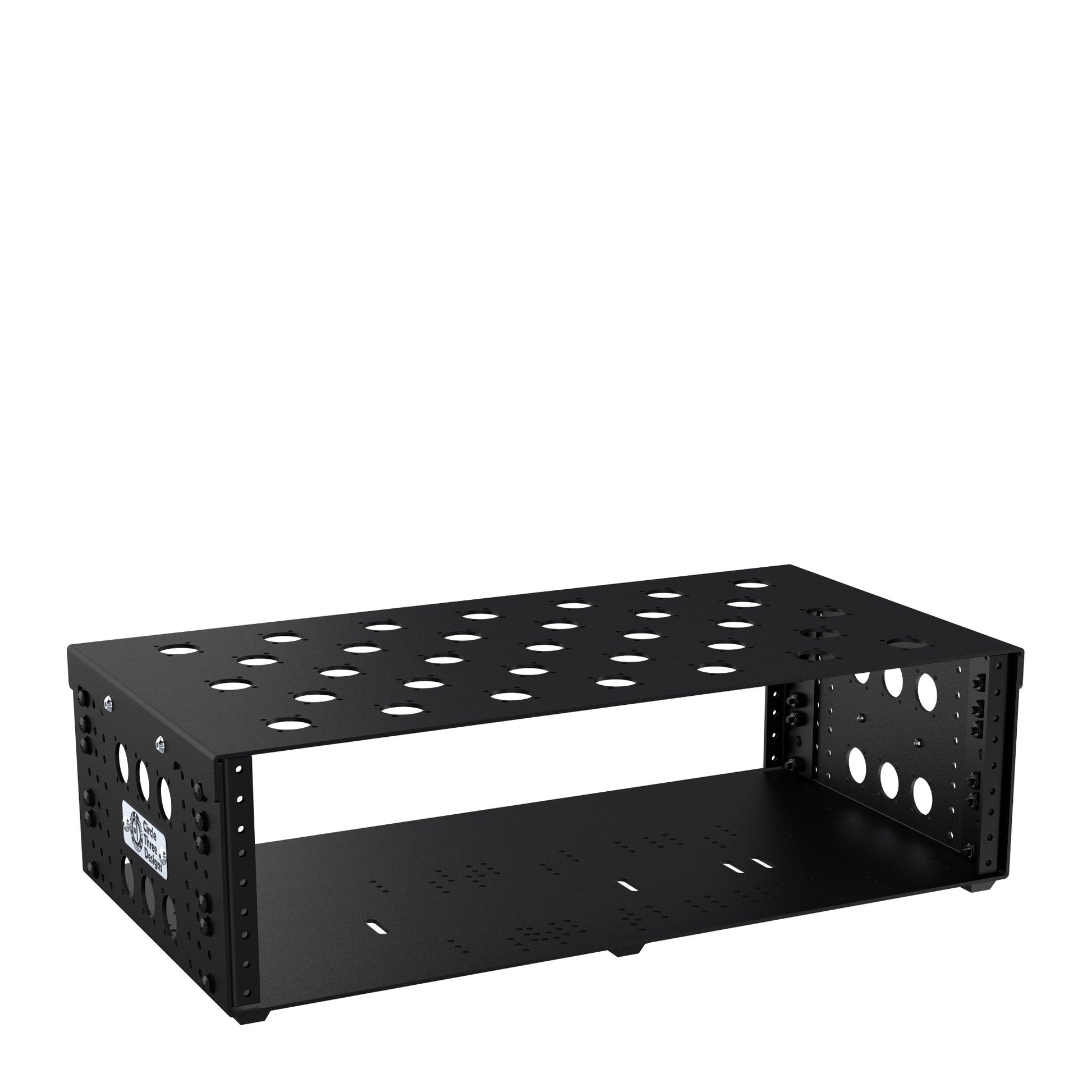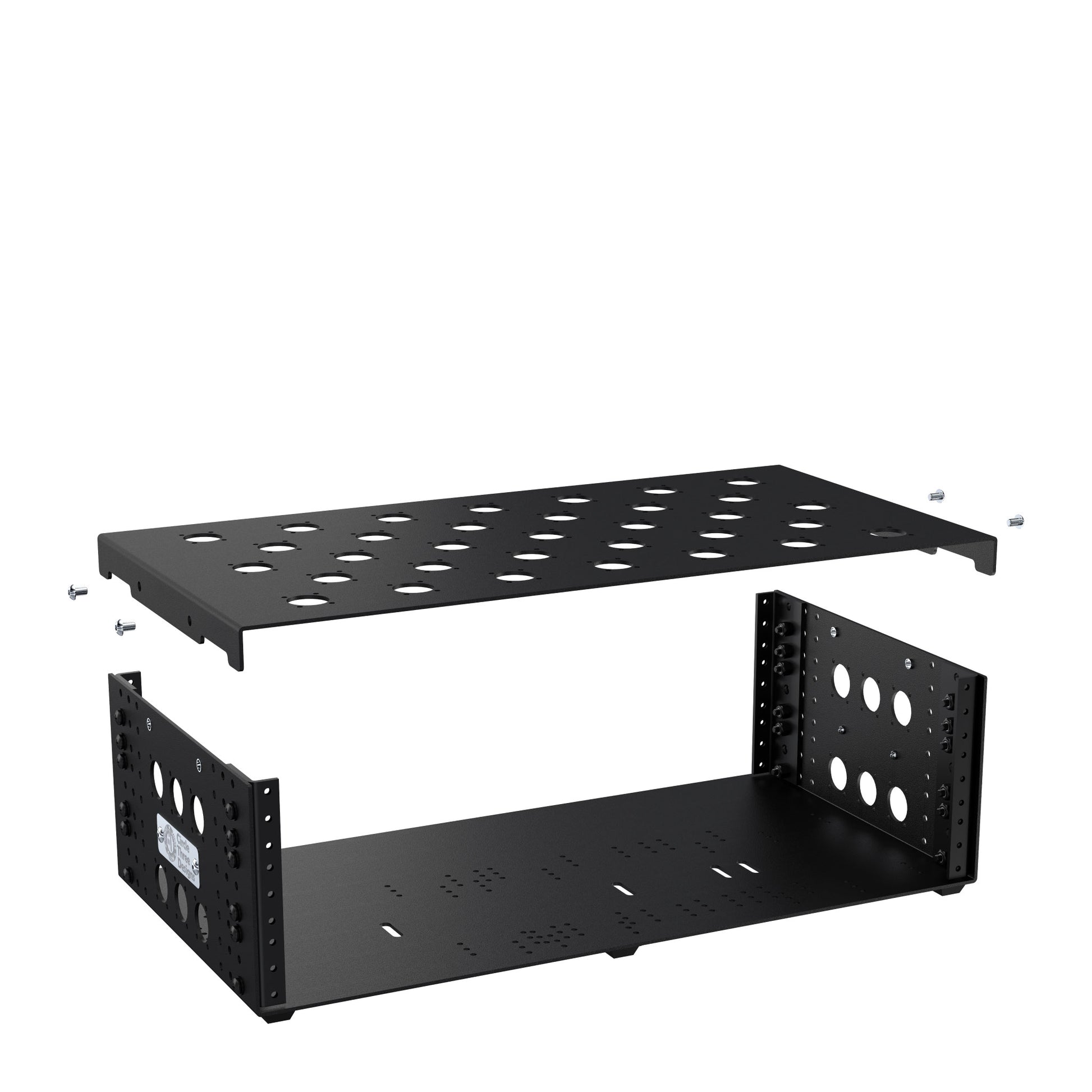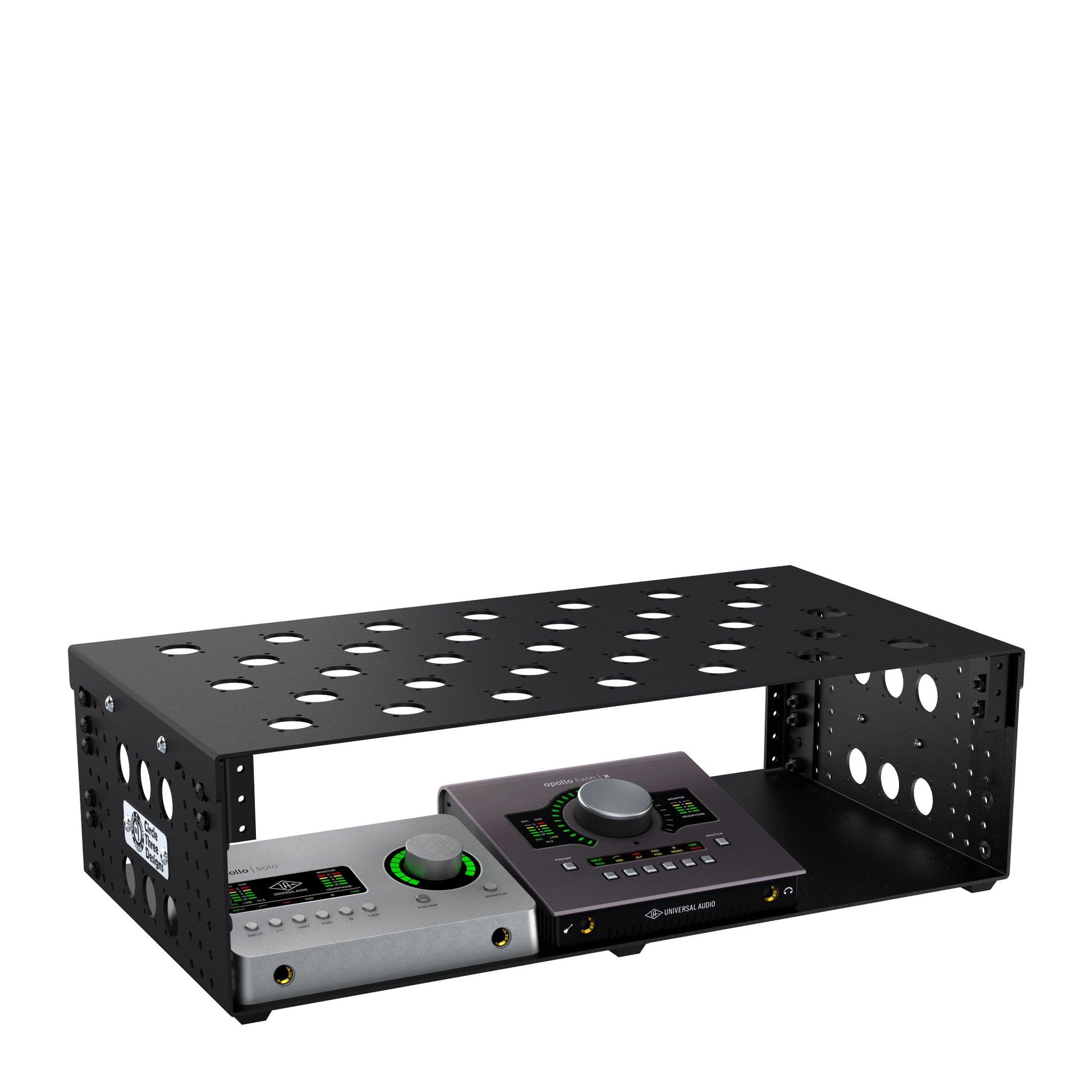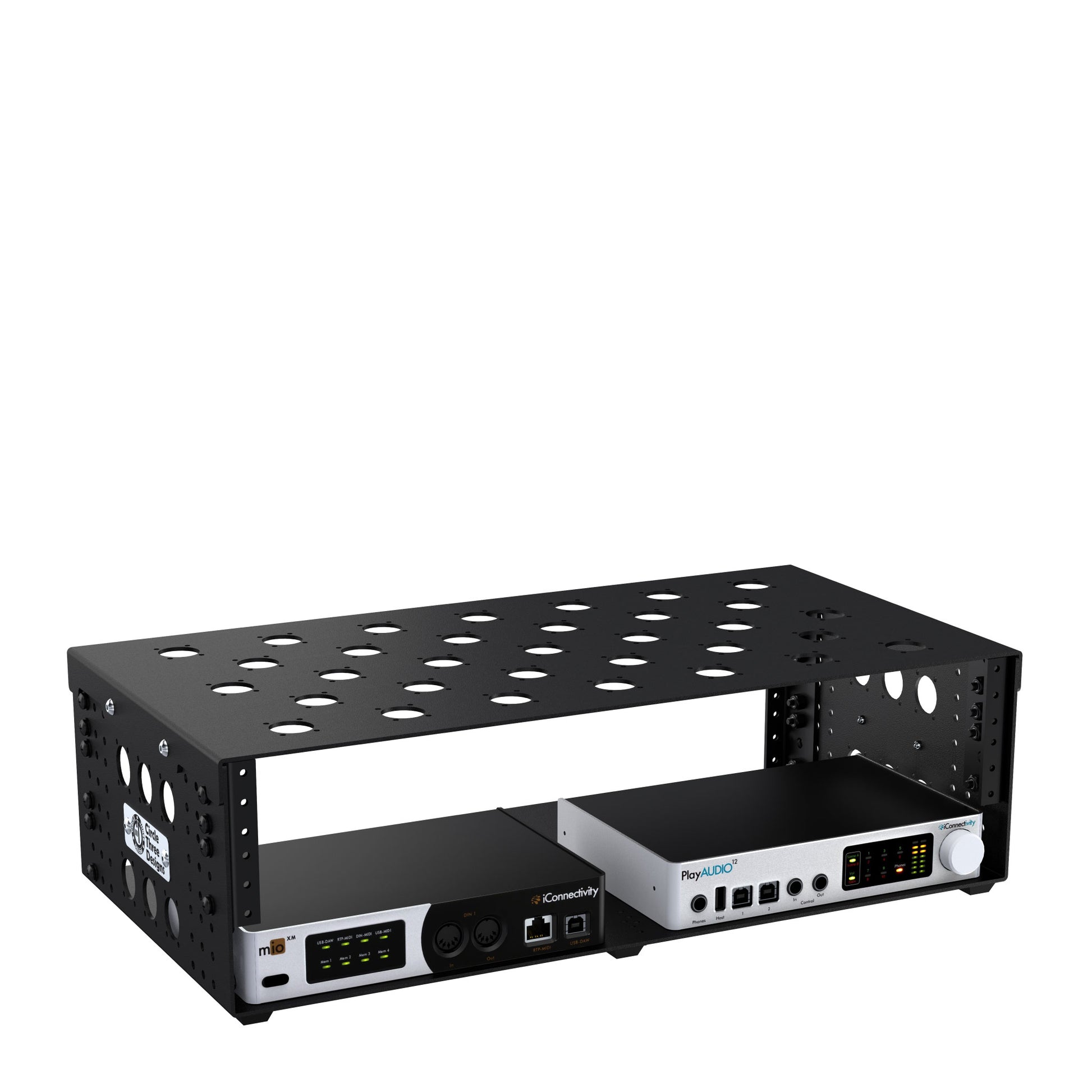 - The bottom of the rack has multiple holes and slots to accommodate the following: iConnectivty PlayAUDIO12 and MioXM, Apollo Twin, Apollo x4, Apollo Solo and Radial Backtrack. Scroll through the photos to see the possibilities.