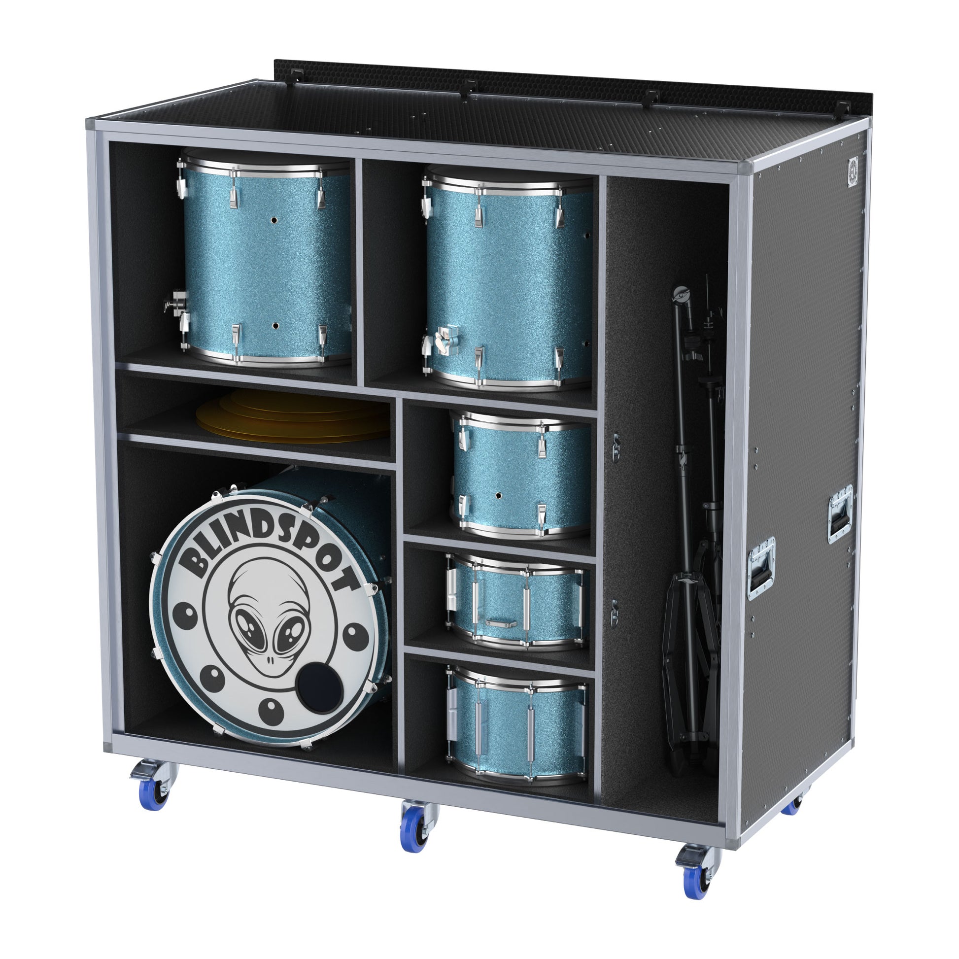 Layout: CPAC Drum Vault Design 1.1. Drum and cymbal cavities have a black polyethylene foam interior, while hardware cavities have a carpet interior.