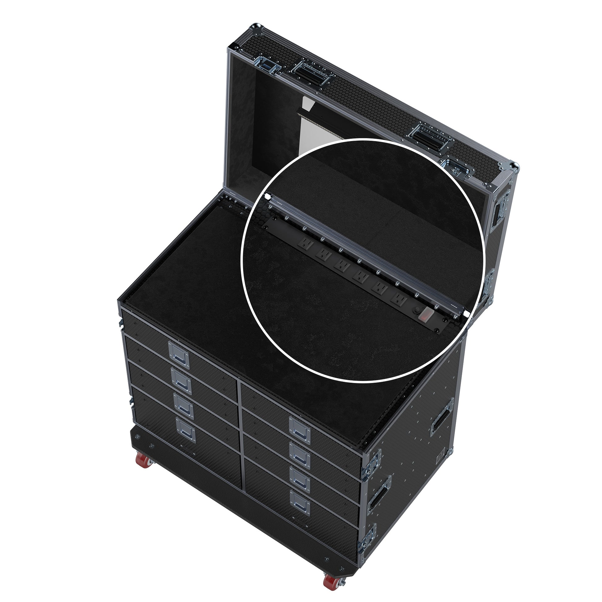 Power: Recessed power distributer on the work surface with 6 Edison outputs. Recessed dish on the exterior of the case with powerCON-in and powerCON-out allowing multiple workstations to be linked together and powered from one source. Recessed dish on the exterior of the case with two blank Neutrik D punchouts for future expansion.