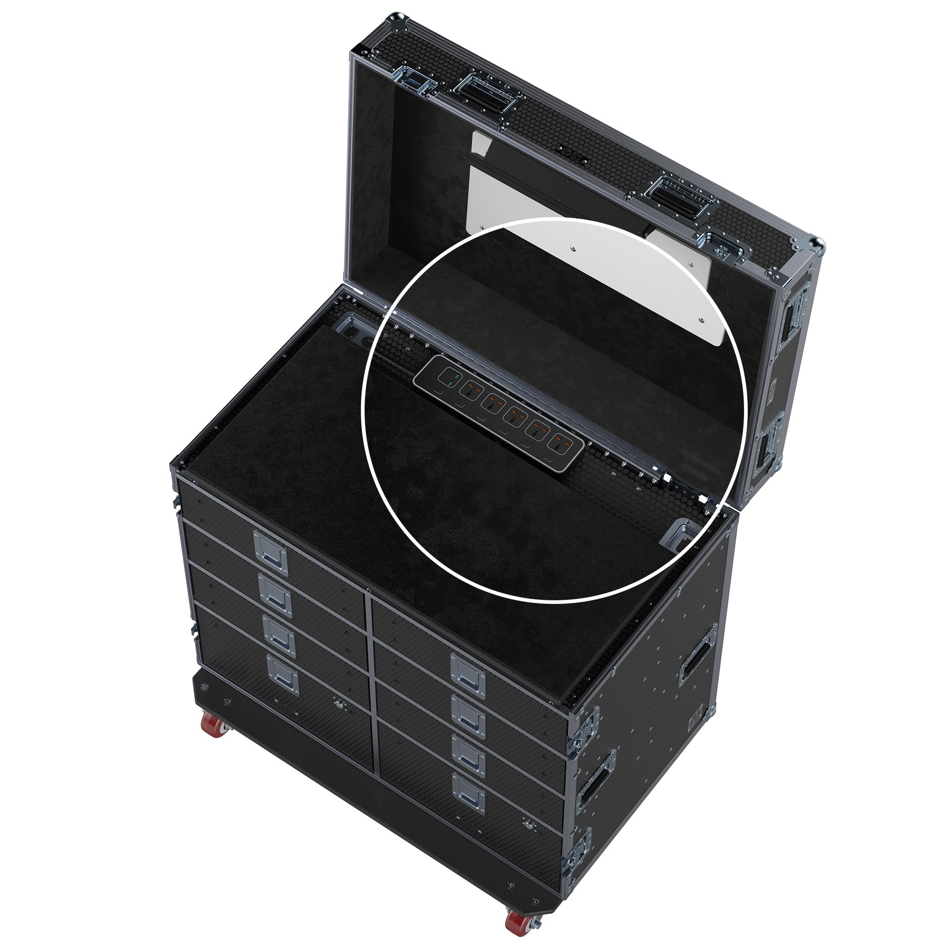 Power: Dual voltage power distributor sits on top of the work surface. Recessed dish on the exterior of the case with powerCON TRUE1-in and powerCON TRUE1-out allowing multiple workstations to be linked together and powered from one source. Recessed dish on the exterior of the case with two blank Neutrik D punchouts for future expansion.