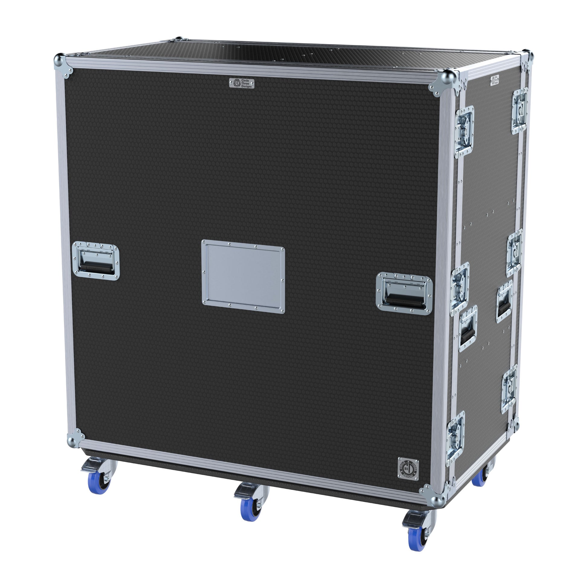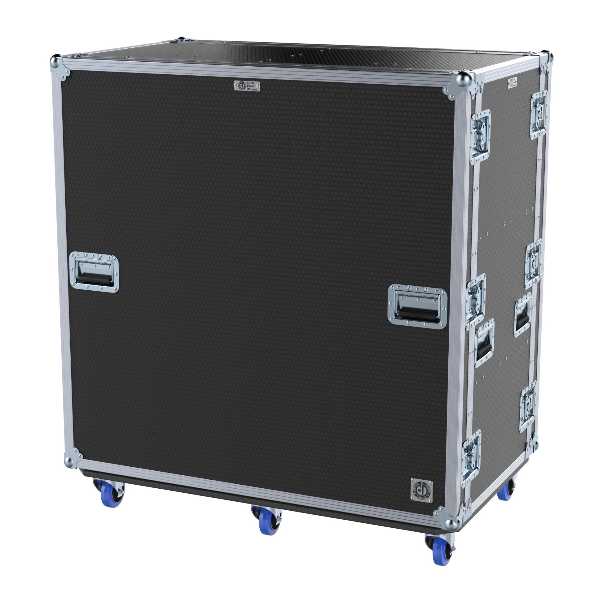 Design: Removable front and rear lids. Custom-sized to fit Circle Three Designs Fly Racks (Hybrid HH, Wood or Aluminum). These racks can be removed and placed into Pelican Air 1637 cases for fly-dates. These cases are 30" deep with ports in the divider behind the fly racks and do not require cables to pass out the back of the case.