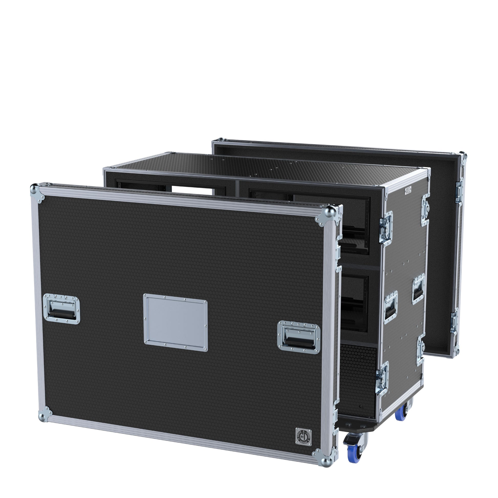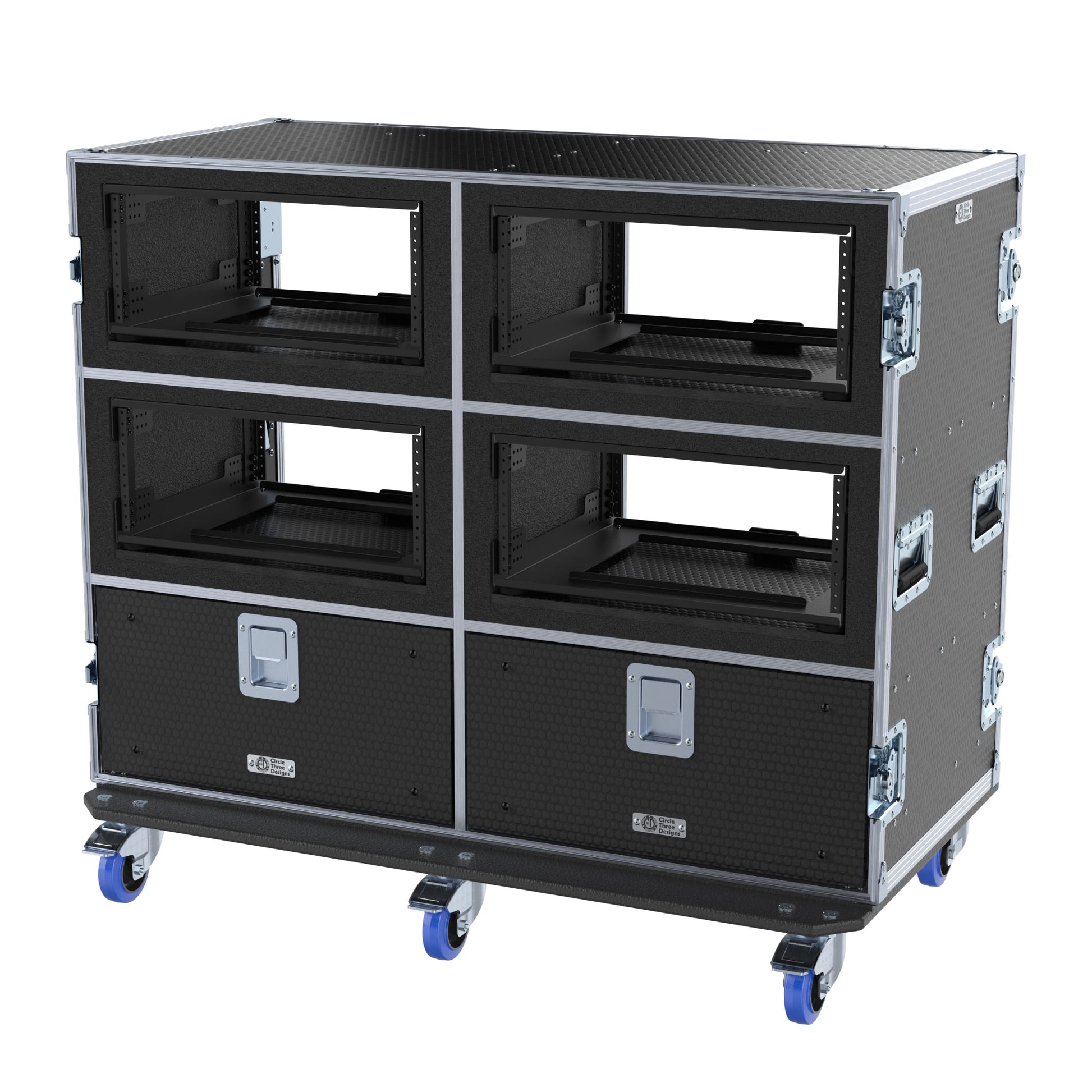 Design: Removable front and rear lids. Custom-sized to fit Circle Three Designs Fly Racks (Hybrid HH, Wood or Aluminum). These racks can be removed and placed into Pelican Air 1637 cases for fly-dates. These cases are 30" deep with ports in the divider behind the fly racks and do not require cables to pass out the back of the case.