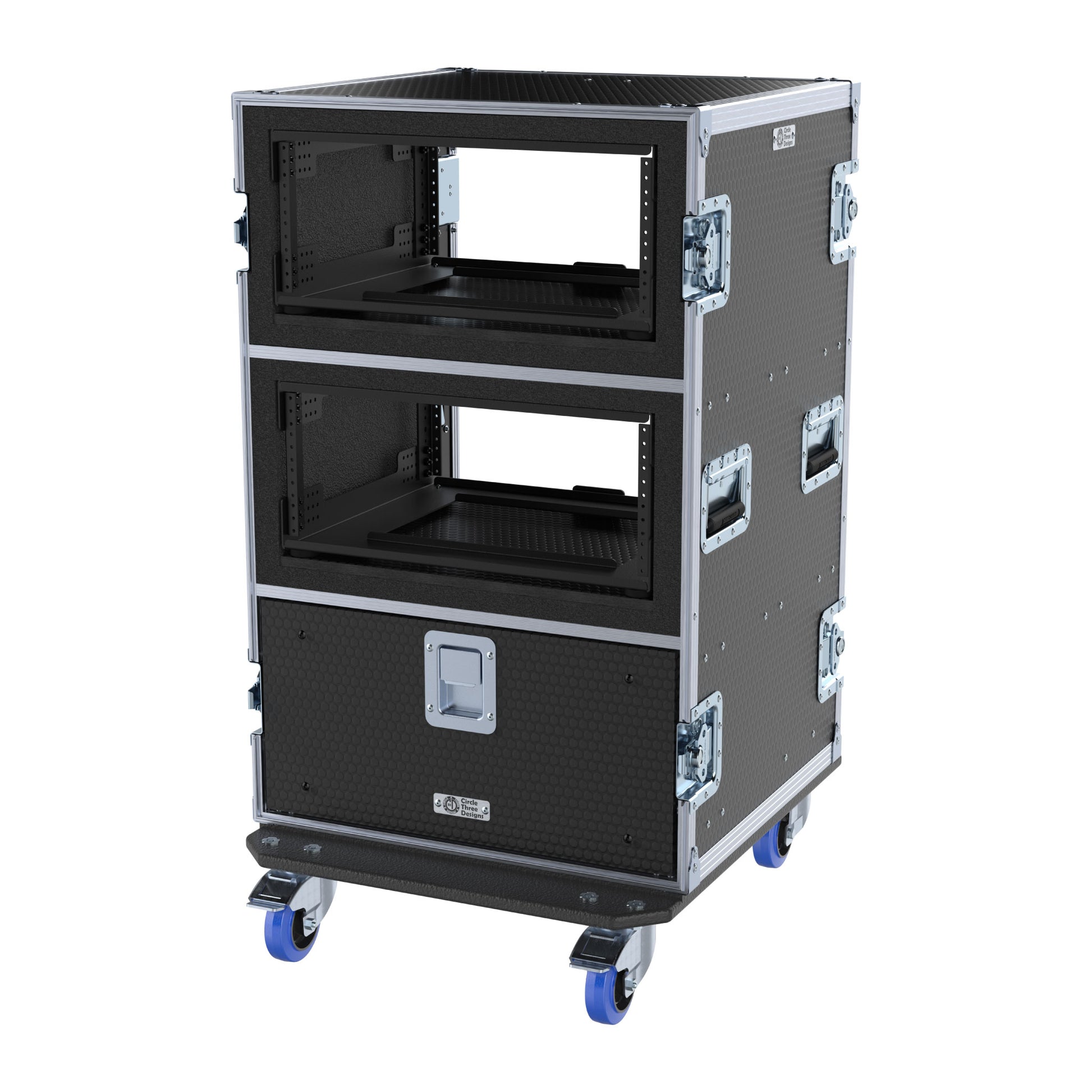 Design: Removable front and rear lids. Custom-sized to fit Circle Three Designs Fly Racks (Hybrid HH, Wood or Aluminum). These racks can be removed and placed into Pelican Air 1637 cases for fly-dates. These cases are 30" deep with ports in the divider behind the fly racks and do not require cables to pass out the back of the case.