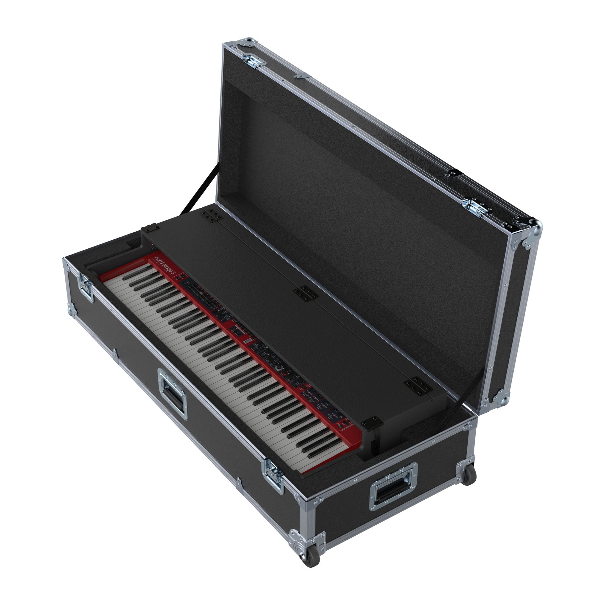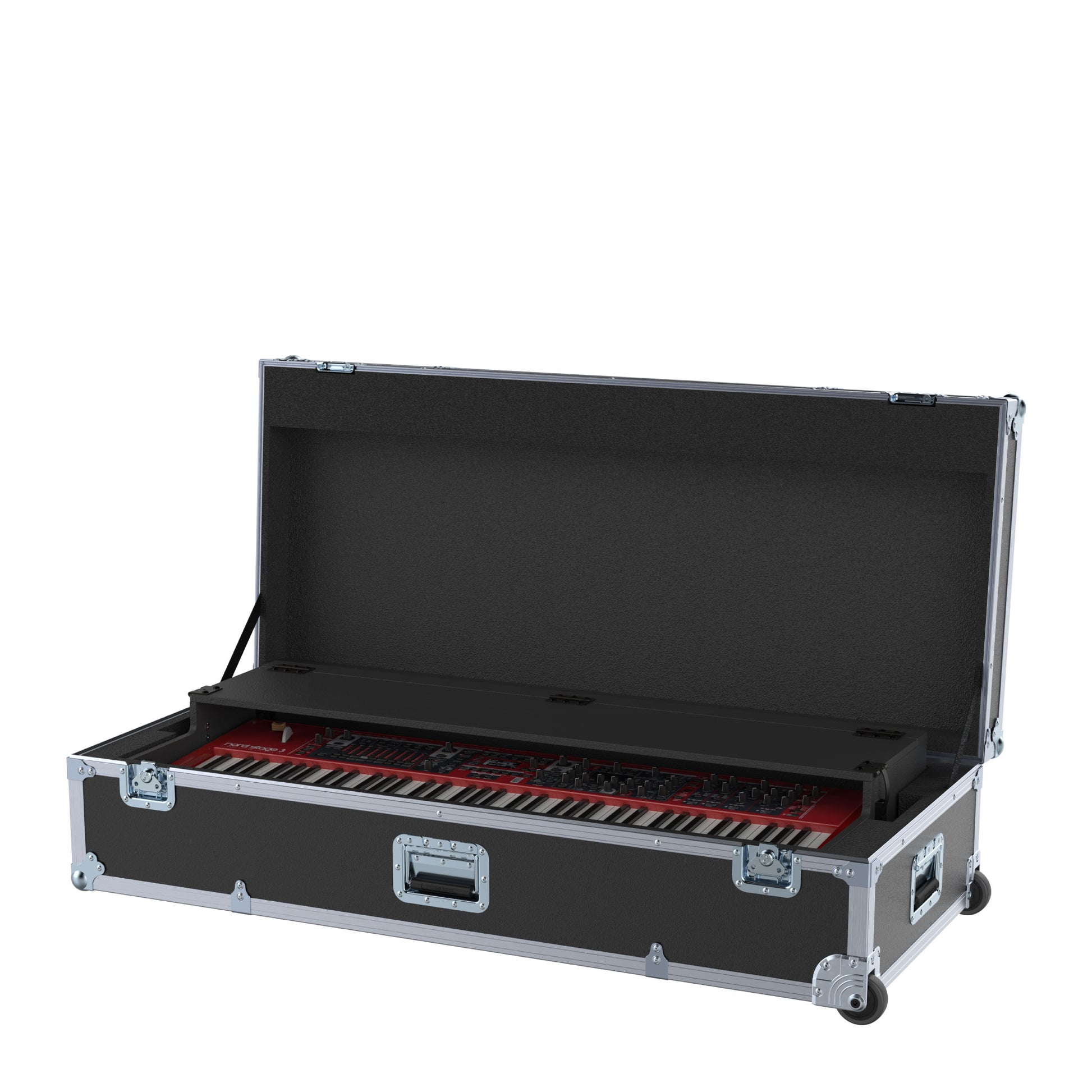 Foam: Minimum 1" black polyethylene foam is used throughout the case. The foam under the keyboard blind has cutouts for the Wurlitzer style legs.