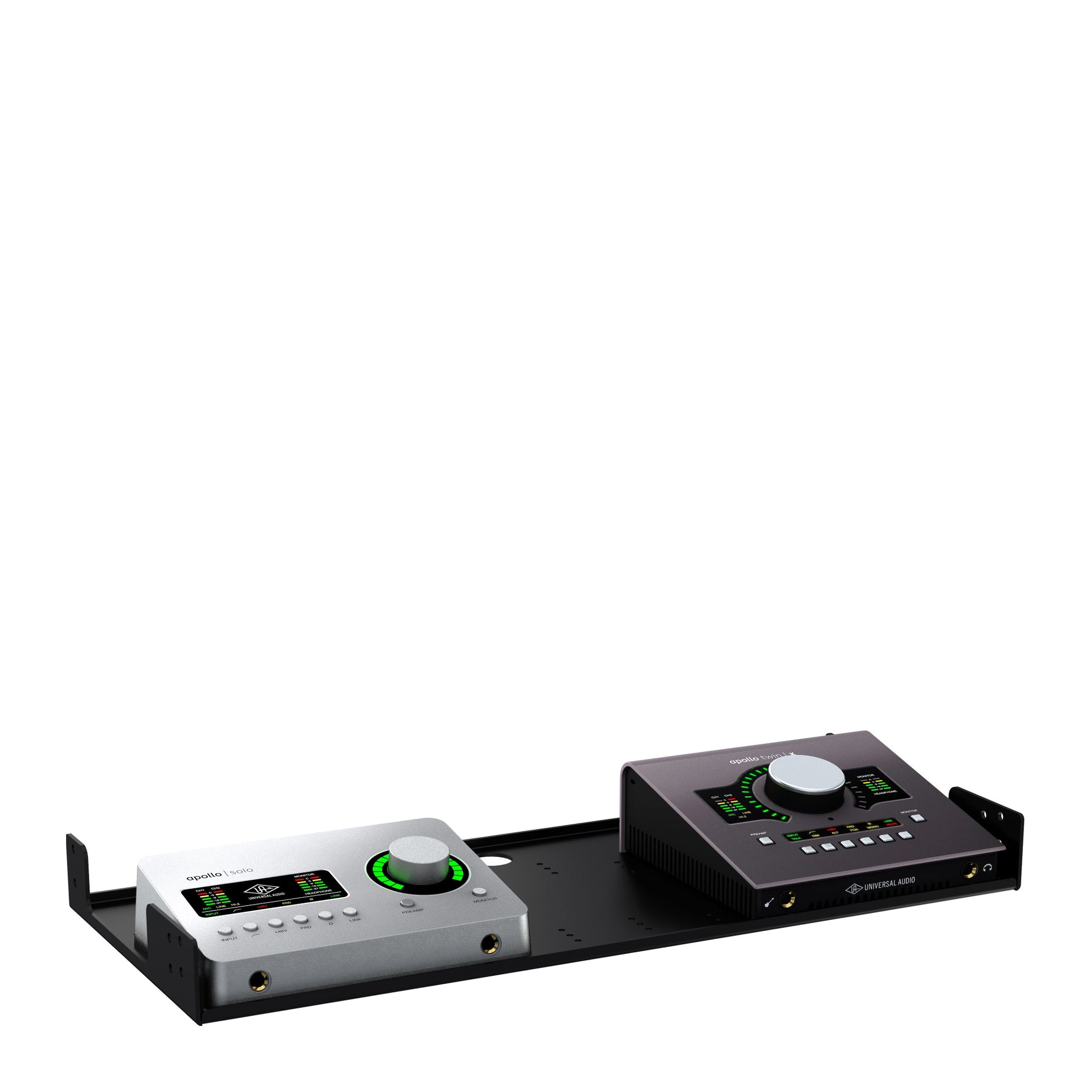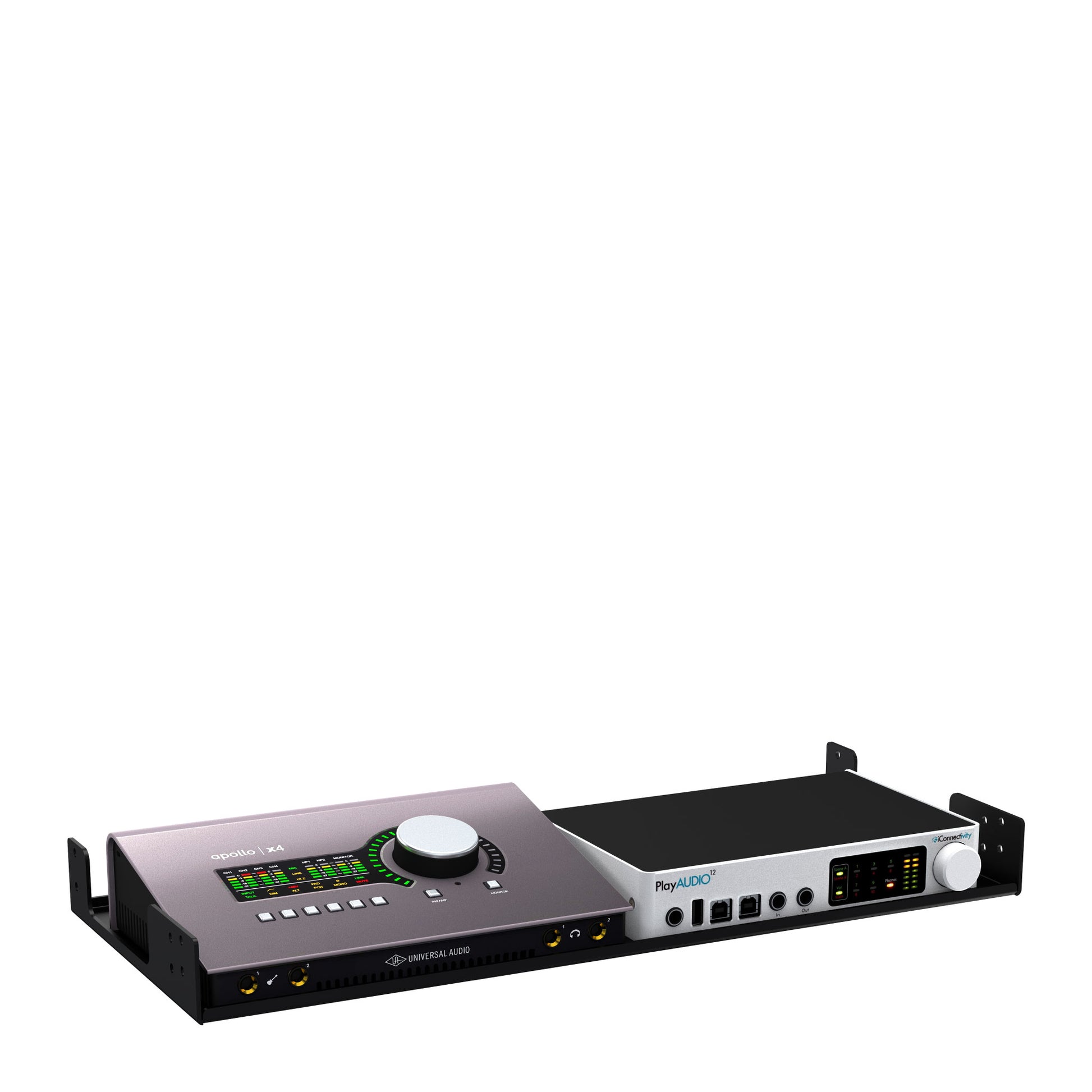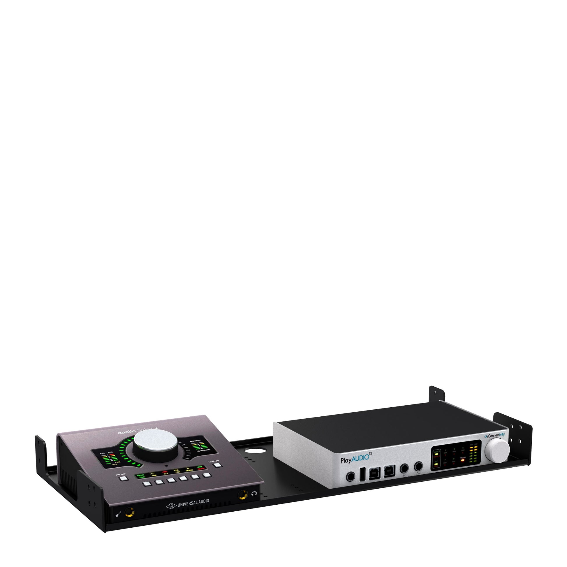 The rack shelf has multiple holes and slots to accommodate the following: iConnectivty PlayAUDIO12 and MioXM, Apollo Twin, Apollo x4, Apollo Solo and Radial Backtrack. Scroll through the photos to see the possibilities.