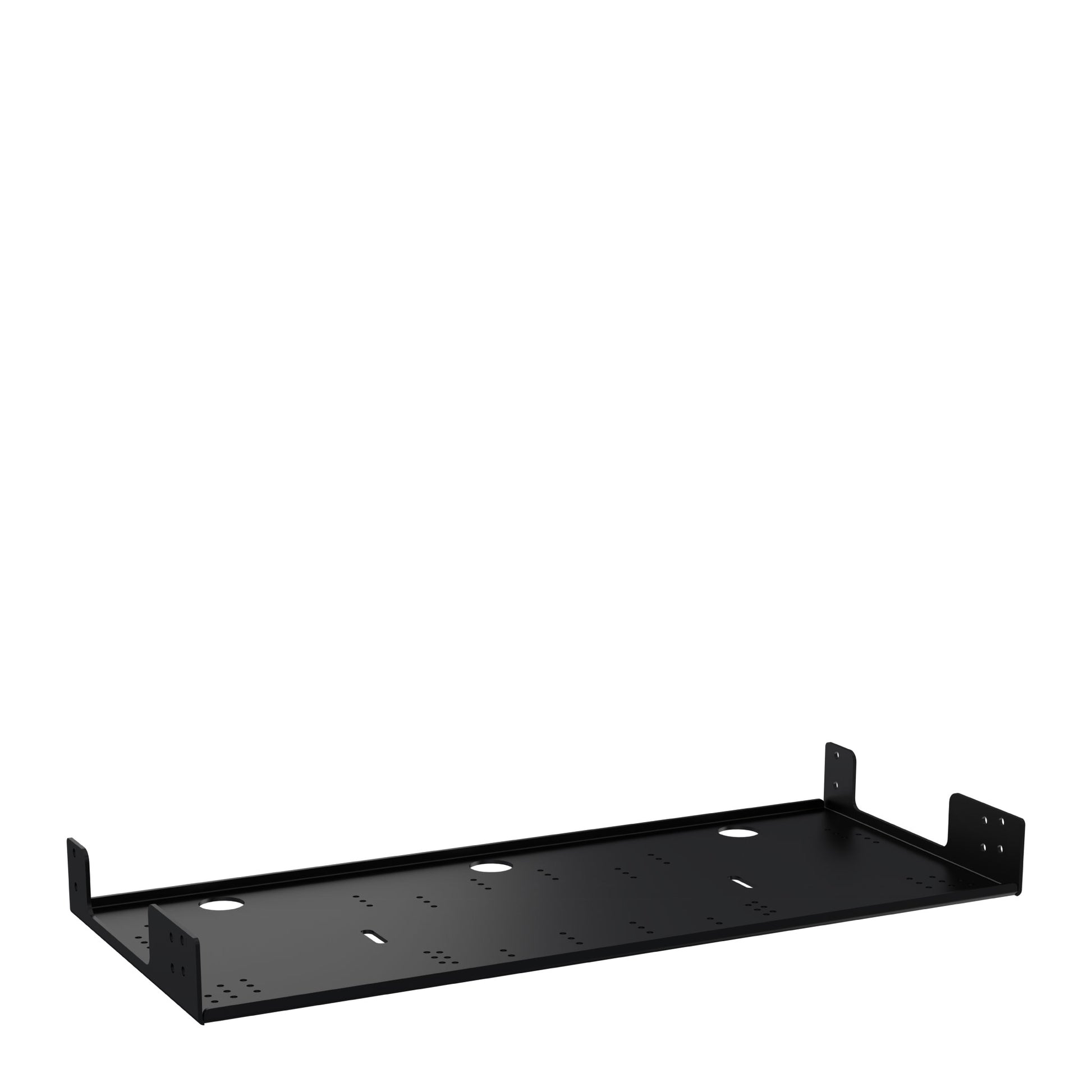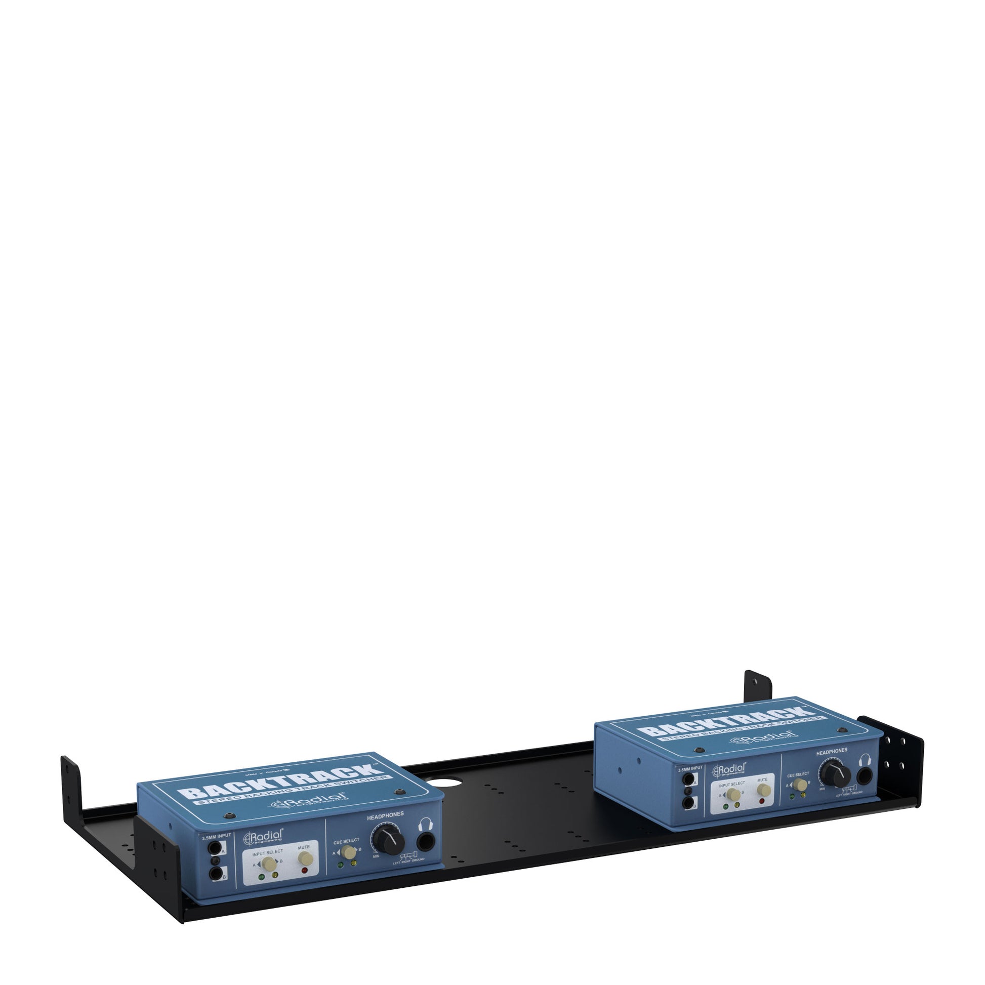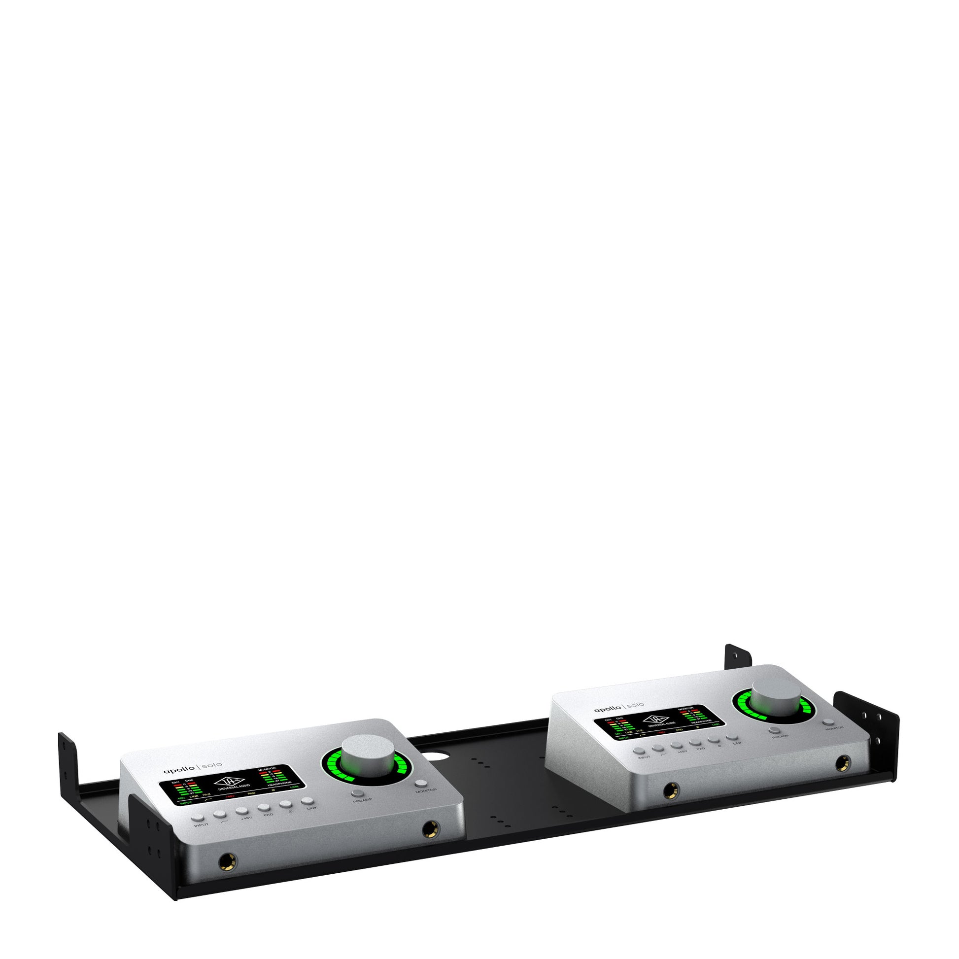 The rack shelf has multiple holes and slots to accommodate the following: iConnectivty PlayAUDIO12 and MioXM, Apollo Twin, Apollo x4, Apollo Solo and Radial Backtrack. Scroll through the photos to see the possibilities.