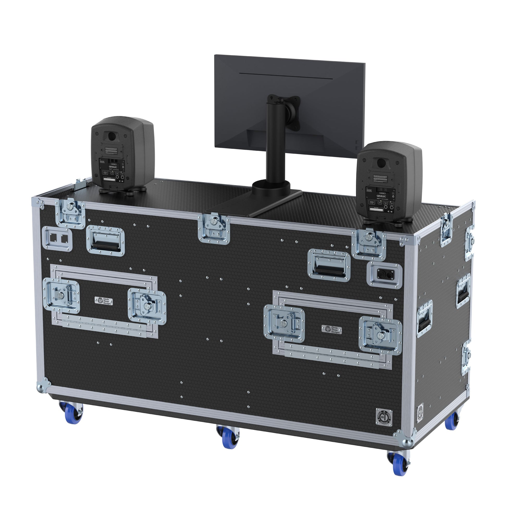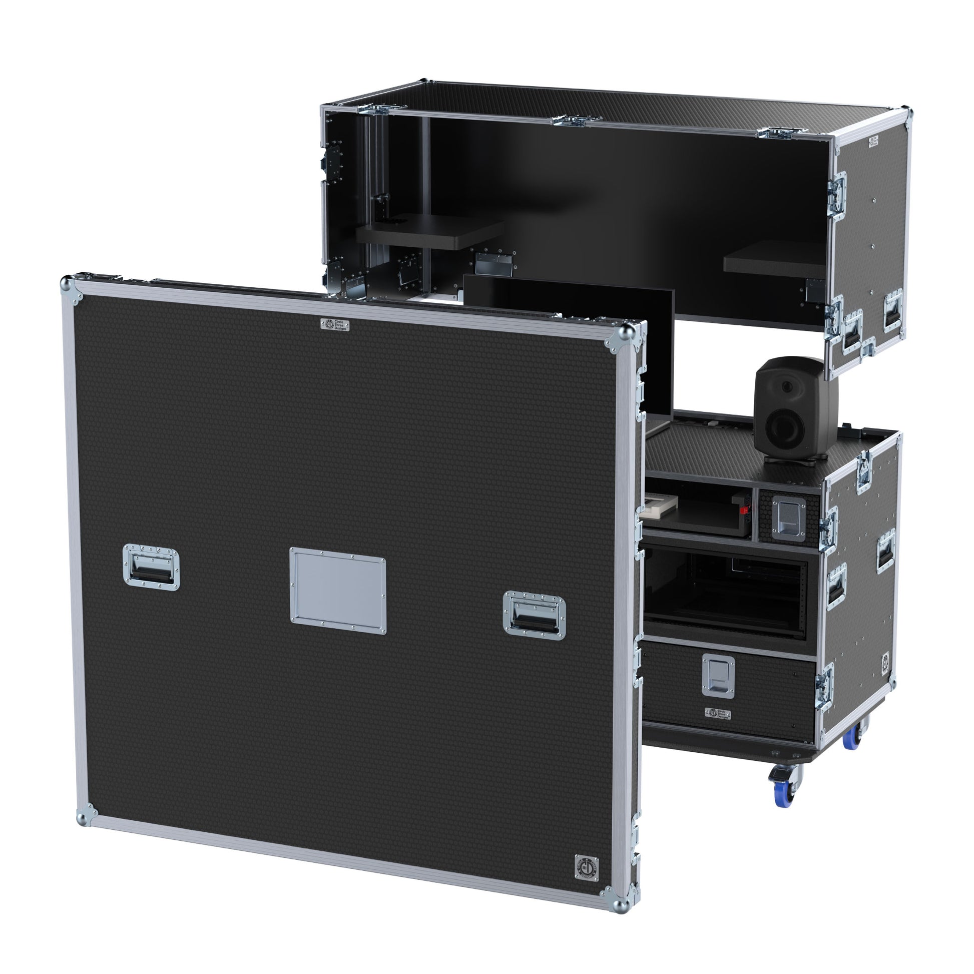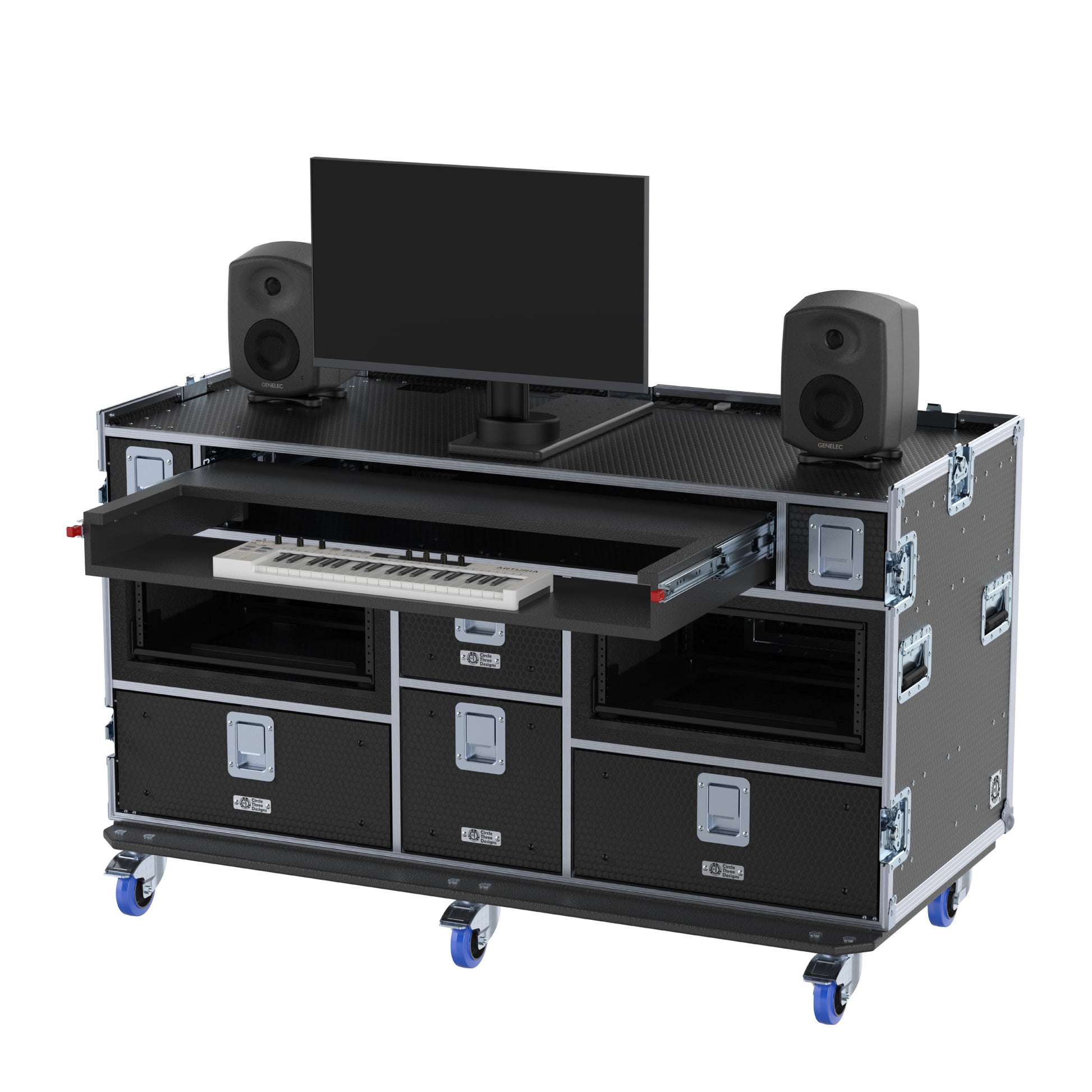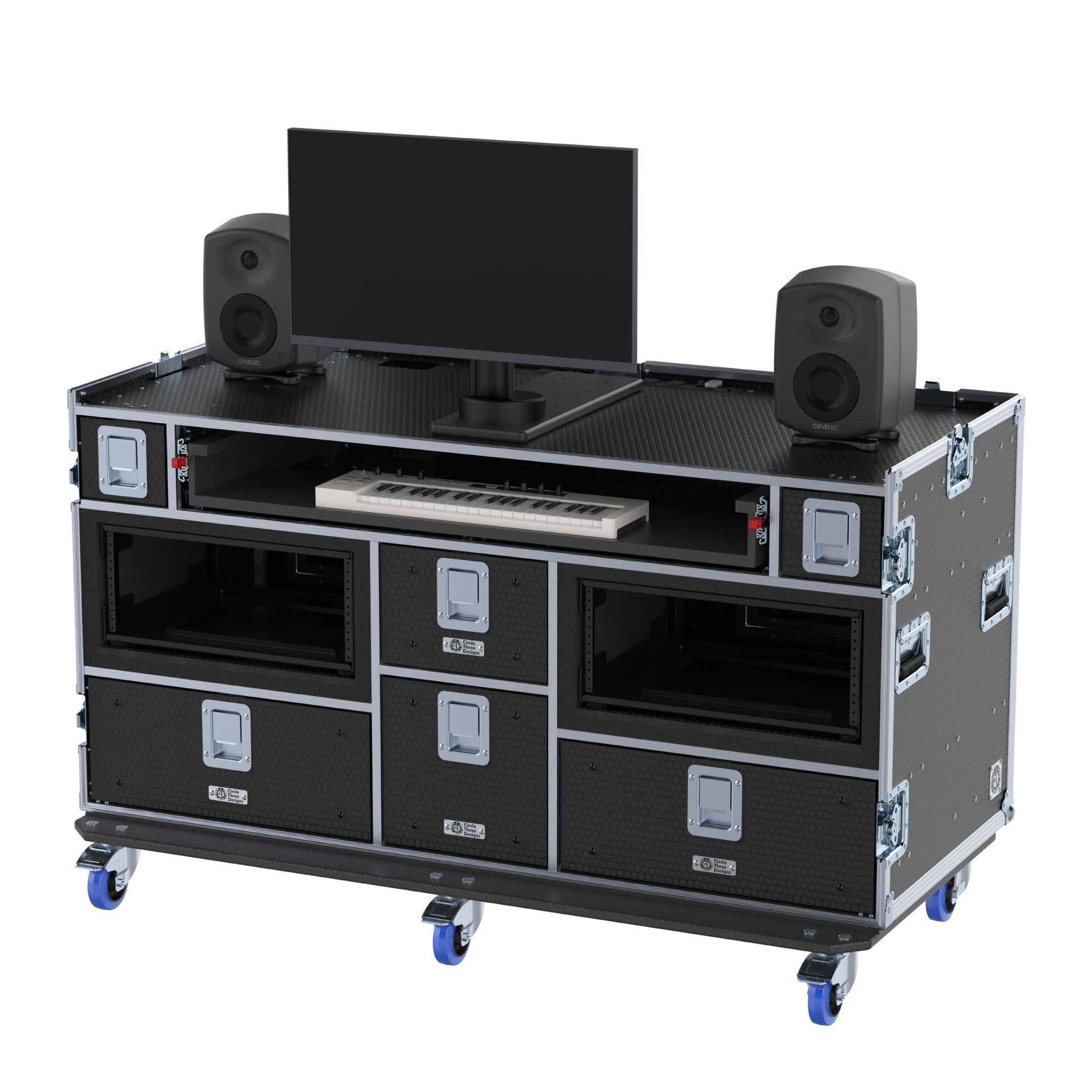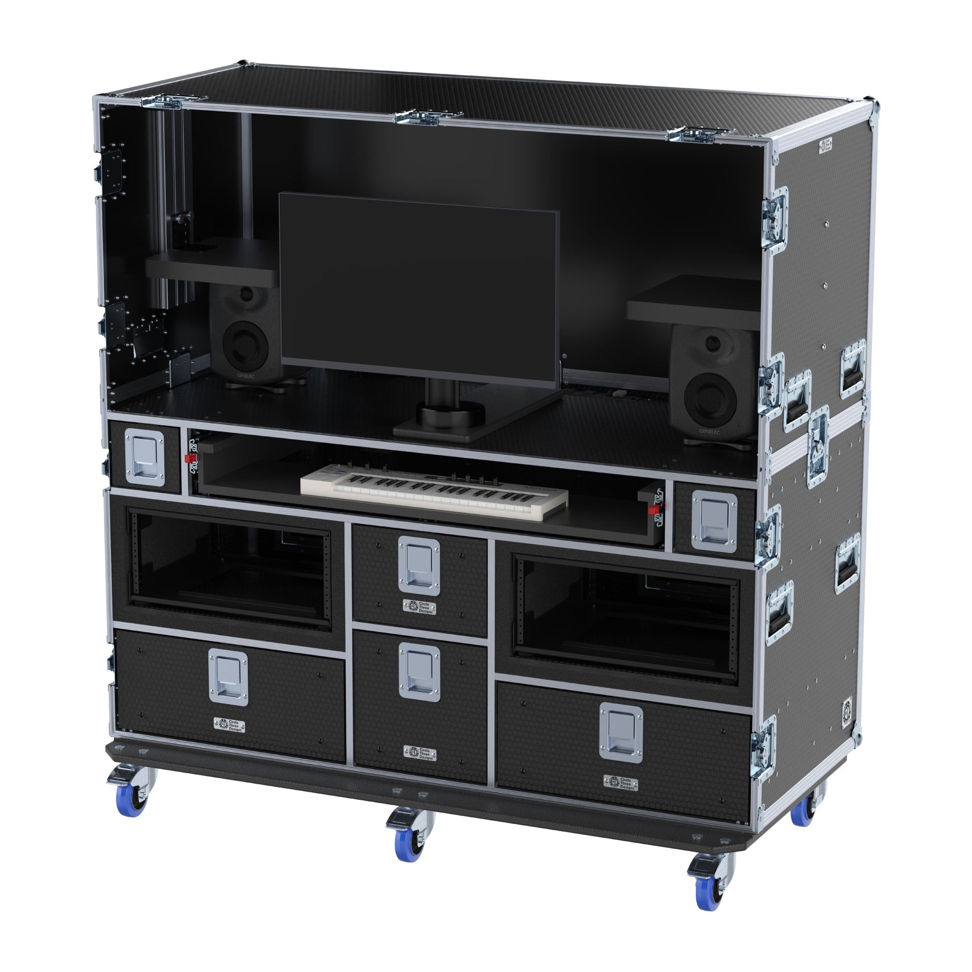 - 4RU or 6RU fly racks can be incorporated into the studio case. These racks can be removed and put into Pelican Air 1637 cases for fly dates or when taken back to the hotel.