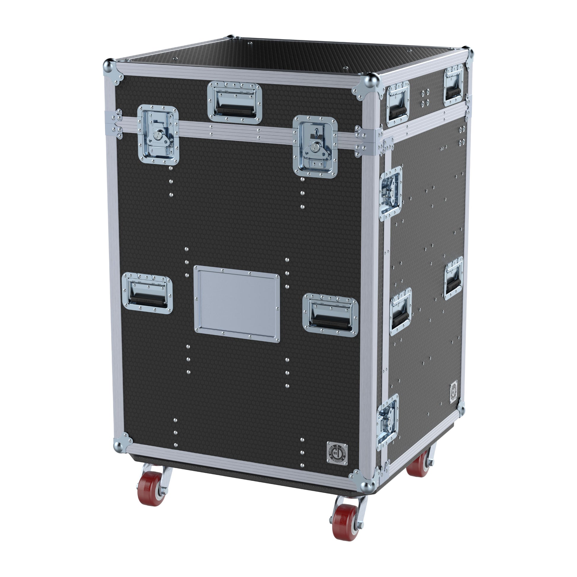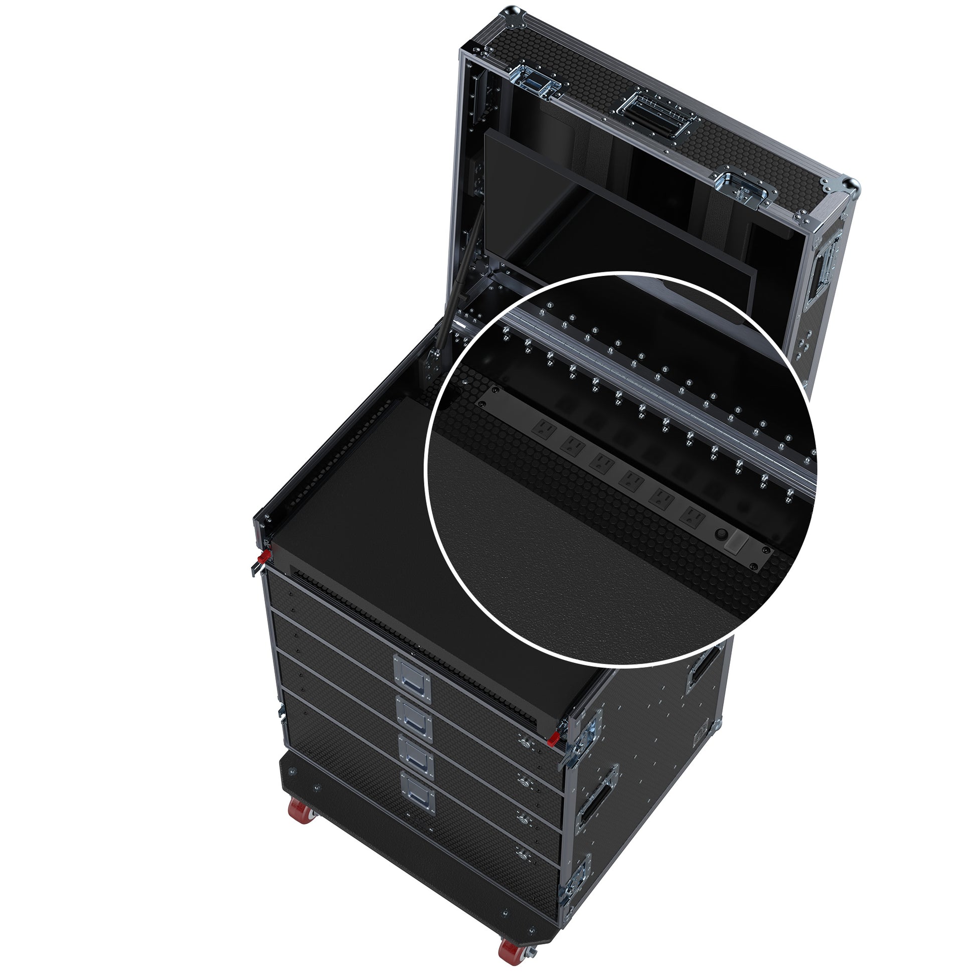 Recessed dish on the exterior of the case with powerCON-in and powerCON-out allowing multiple workstations to be linked together and powered from one source. Ethernet pass through connector included. Five blank Neutrik D punchouts for future expansion.