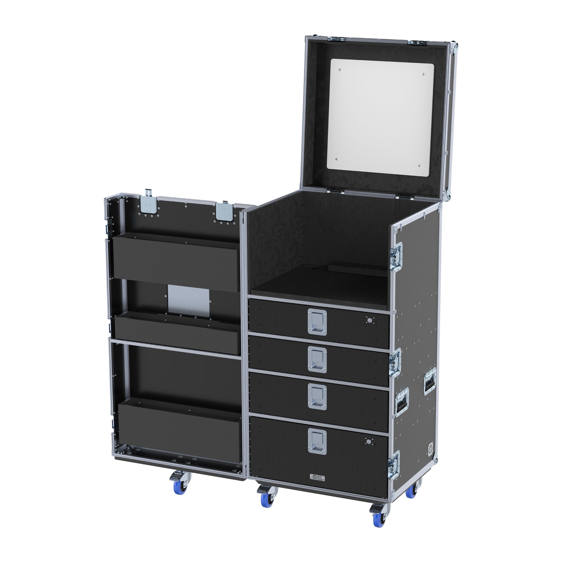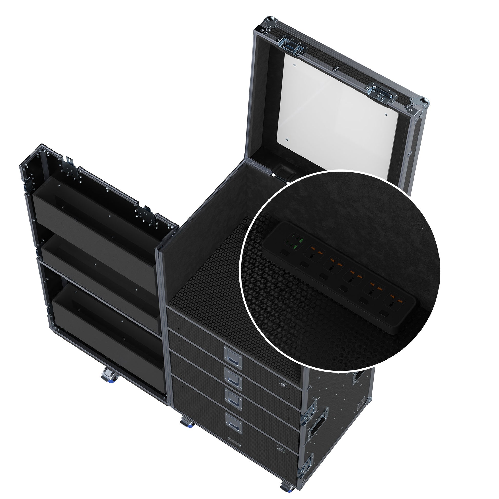 Power: Dual voltage power distributor sits on top of the work surface. Recessed dish on the exterior of the case with powerCON TRUE1-in and powerCON TRUE1-out allowing multiple workstations to be linked together and powered from one source. Recessed dish on the exterior of the case with two blank Neutrik D punchouts for future expansion.