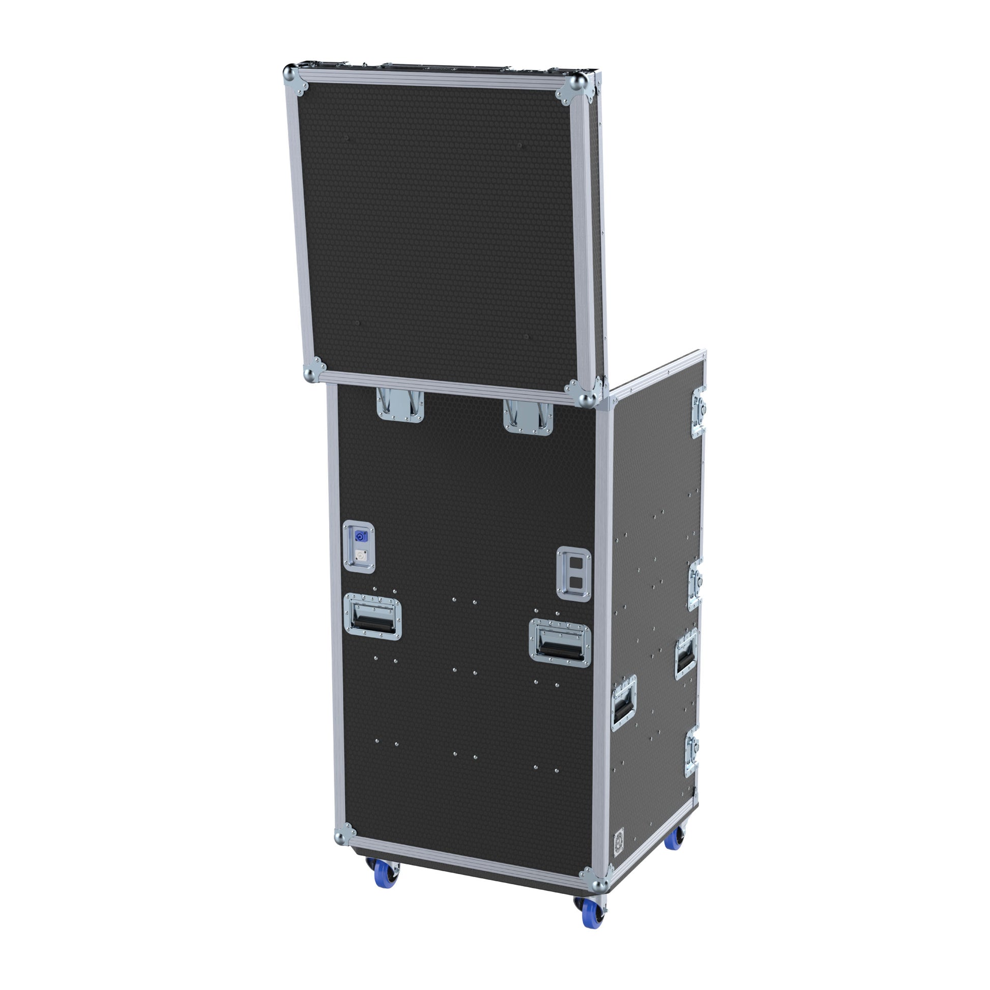 Power: Recessed power distributer on the work surface with 6 Edison outputs. Recessed dish on the exterior of the case with powerCON-in and powerCON-out allowing multiple workstations to be linked together and powered from one source. Recessed dish on the exterior of the case with two blank Neutrik D punchouts for future expansion.