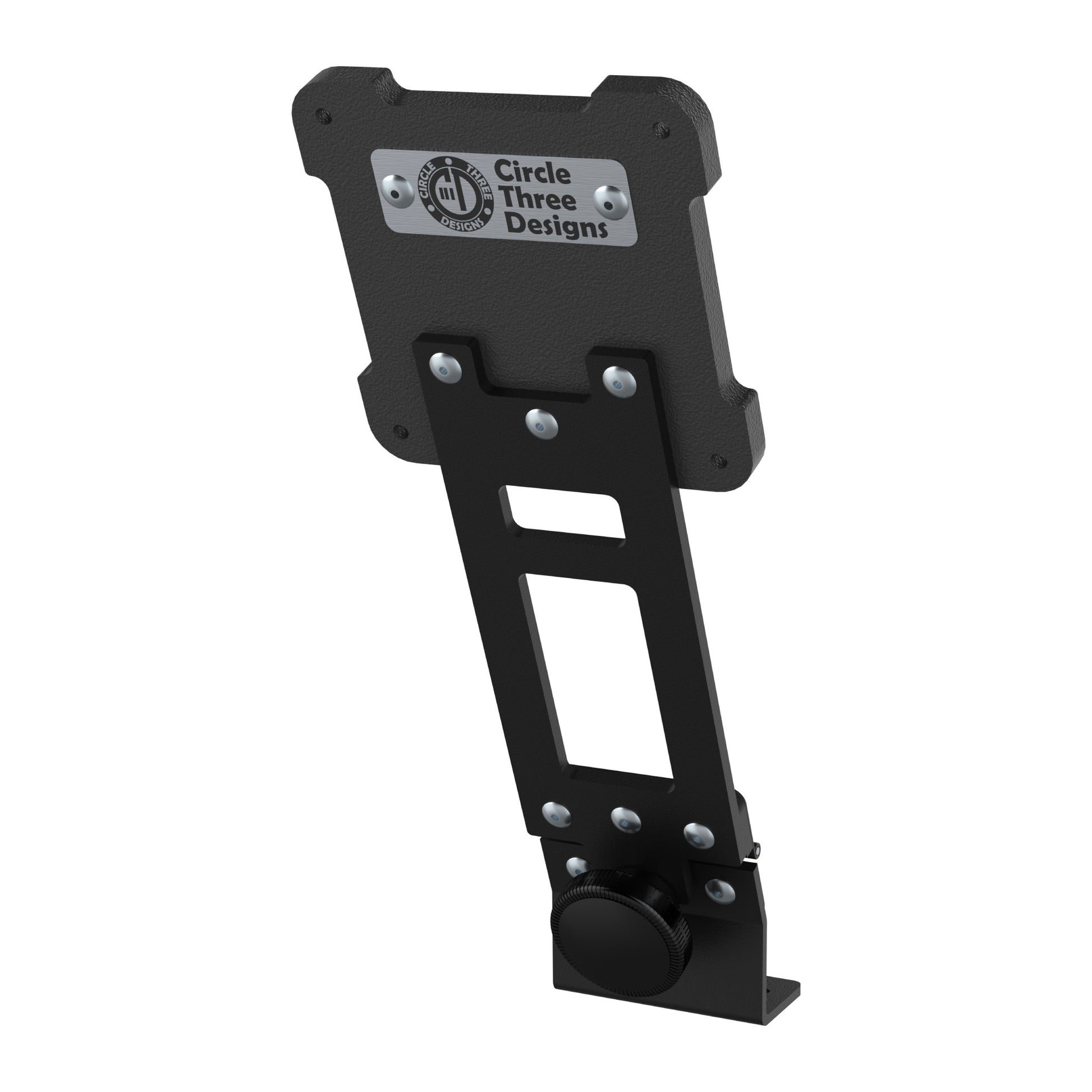 This mount is compatible with Circle Three Designs 4RU Aluminum Gen 2.0 Fly Rack, 4RU Wood Fly Rack (user will have to drill own holes), Dual monitor Fly Rack, and FIT Fly Rack.