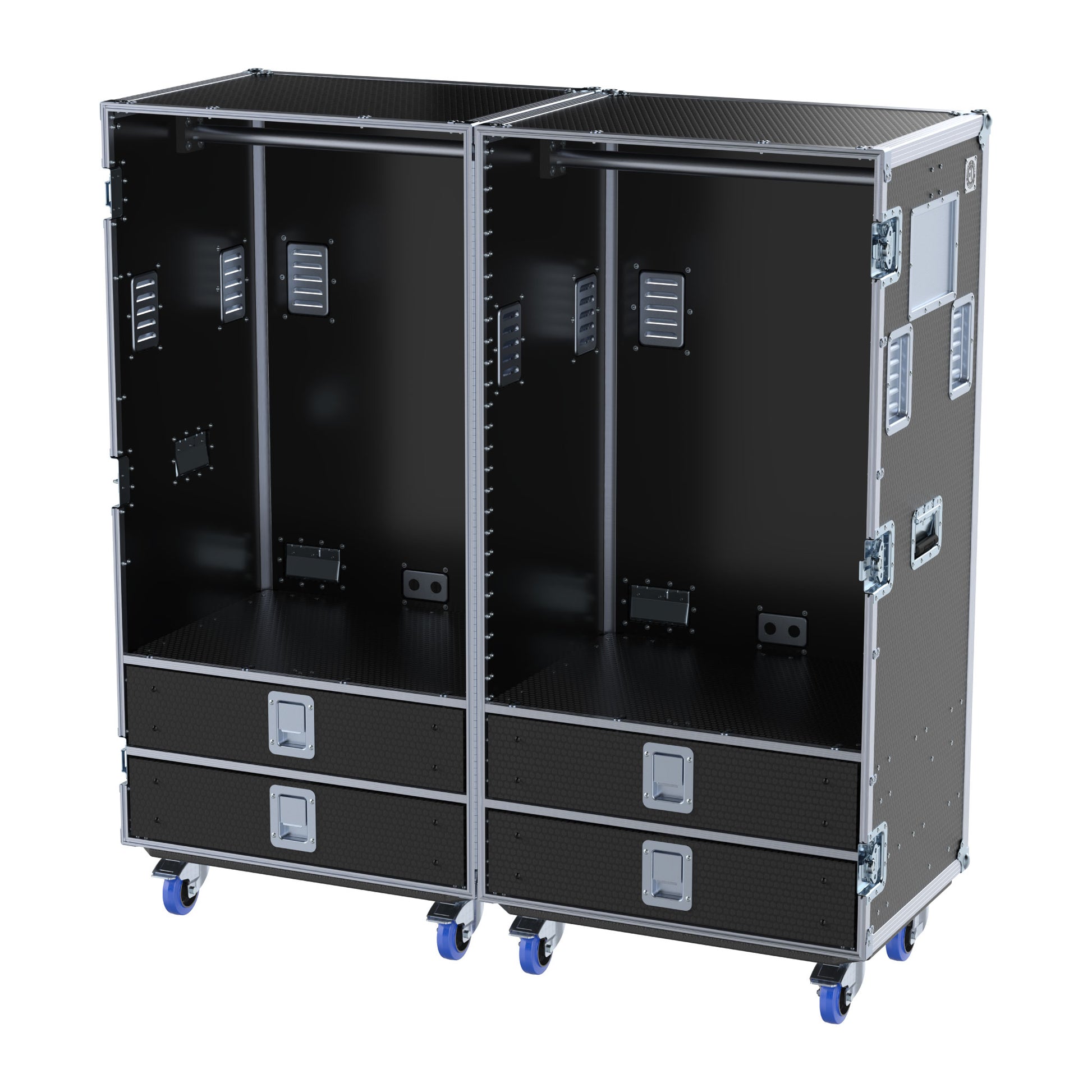 Vents: Minimum 2 recessed vents on each side of the case (with a clothing rod) to maximize air flow. 1 vent on the back of each drawer with a matching vent on the road case.